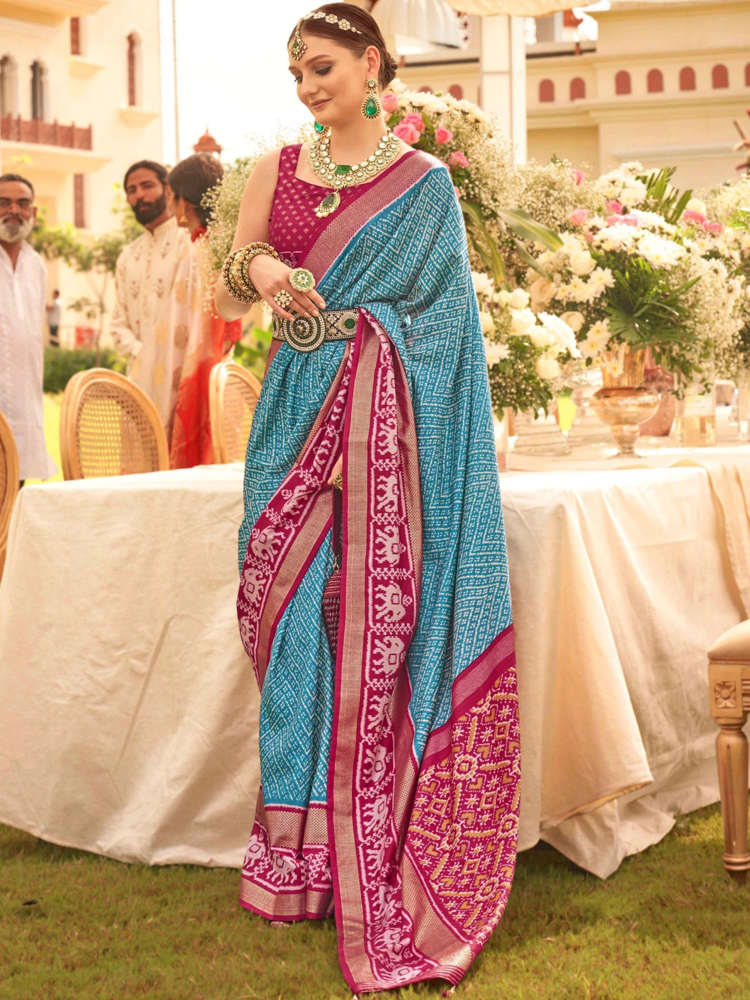 Capture the symbol of confidence and charm in you wearing this cerulean blue color saree designed in silk. Enhanced using bandhej print patterns, showcasing distinstive borders and pallu. Paired with a matching pink color blouse in silk. Note: The accessories featured are purely for fashion purposes. Due to photography reasons, some color variations may occur. The un-stitched blouse may be customized up to 42 inches.