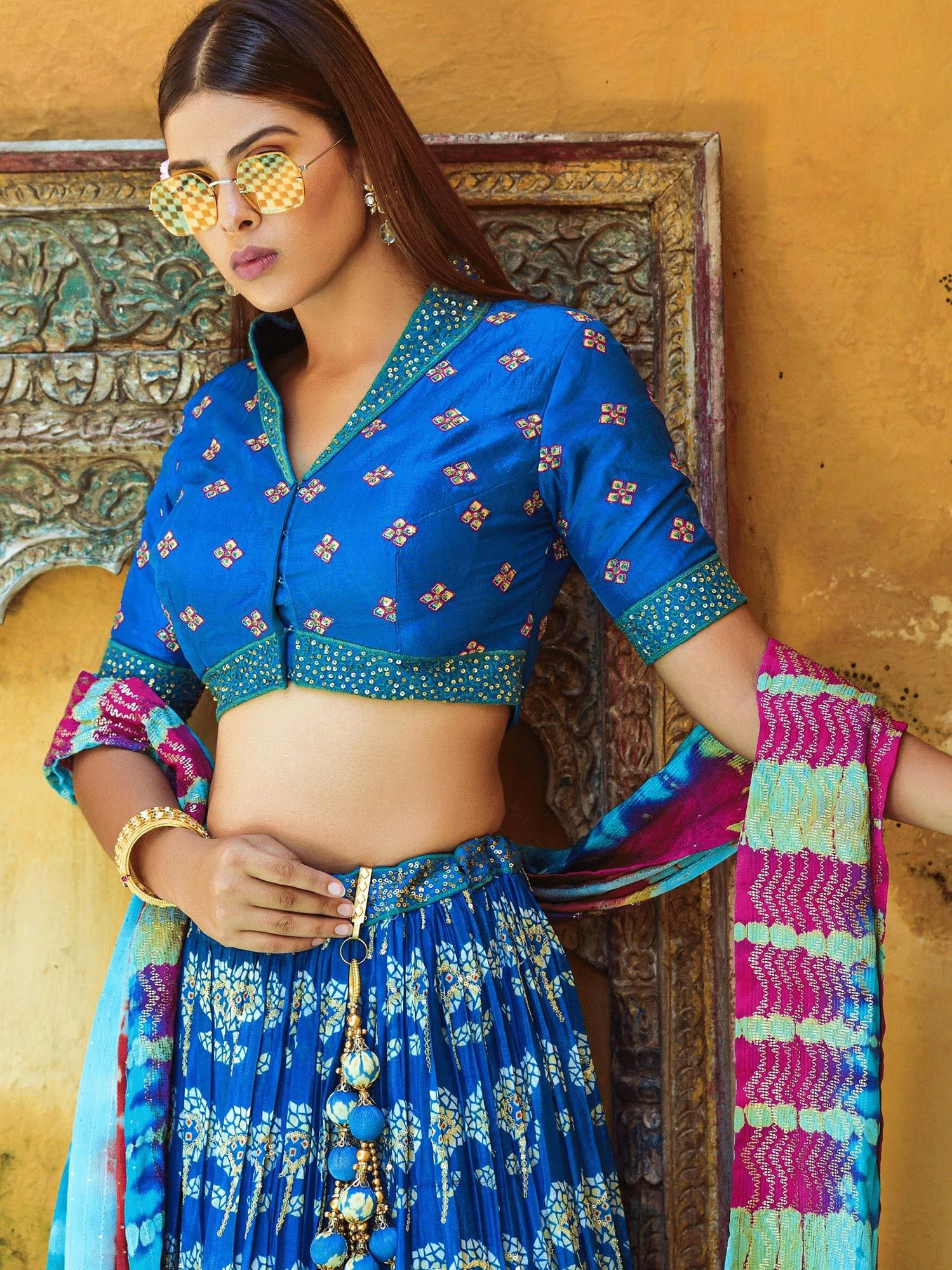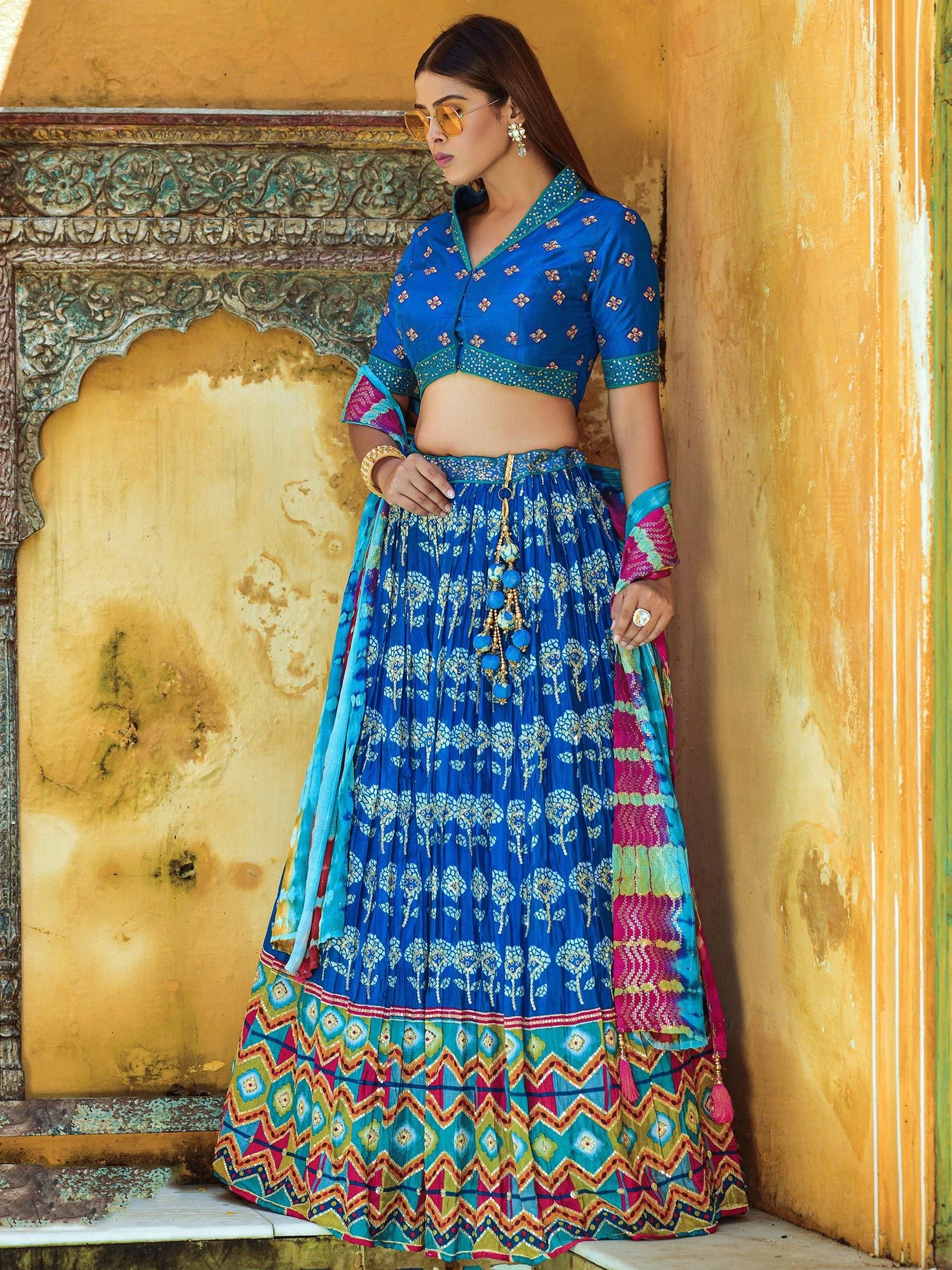 Be the epitome of grace wearing this cobalt blue color lehenga in viscose. Designed with printed patterns all over, sequins, zari and thread embroidered work. Teamed with a matching blue color embroidered choli and a multicolor printed dupatta made in viscose. Note: The accessories featured are purely for fashion purposes. Due to photography reasons, some color variations may occur. The semi-stitched choli and lehenga waist may be customized up to 42 inches.