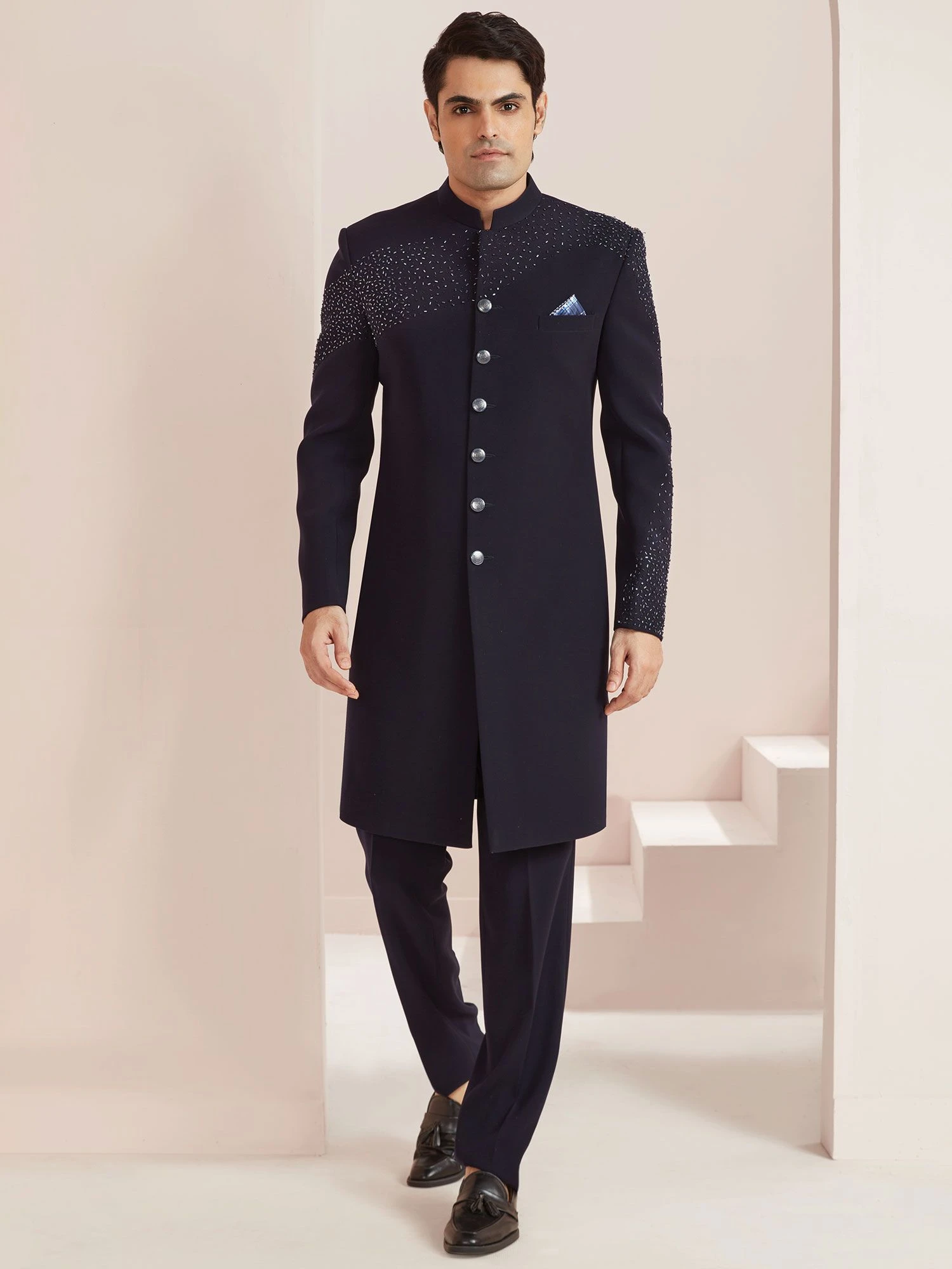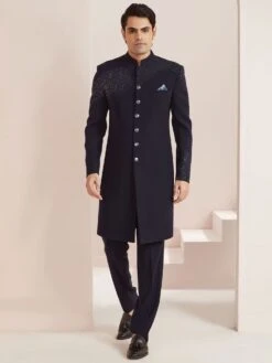 Displaying this navy blue color indo western made in silk. Crafted using stone embellished work. Paired with blue color trouser in silk. Note: Some color variations may occur owing to photography causes. Up to 1 inch of measurement fluctuation is possible.