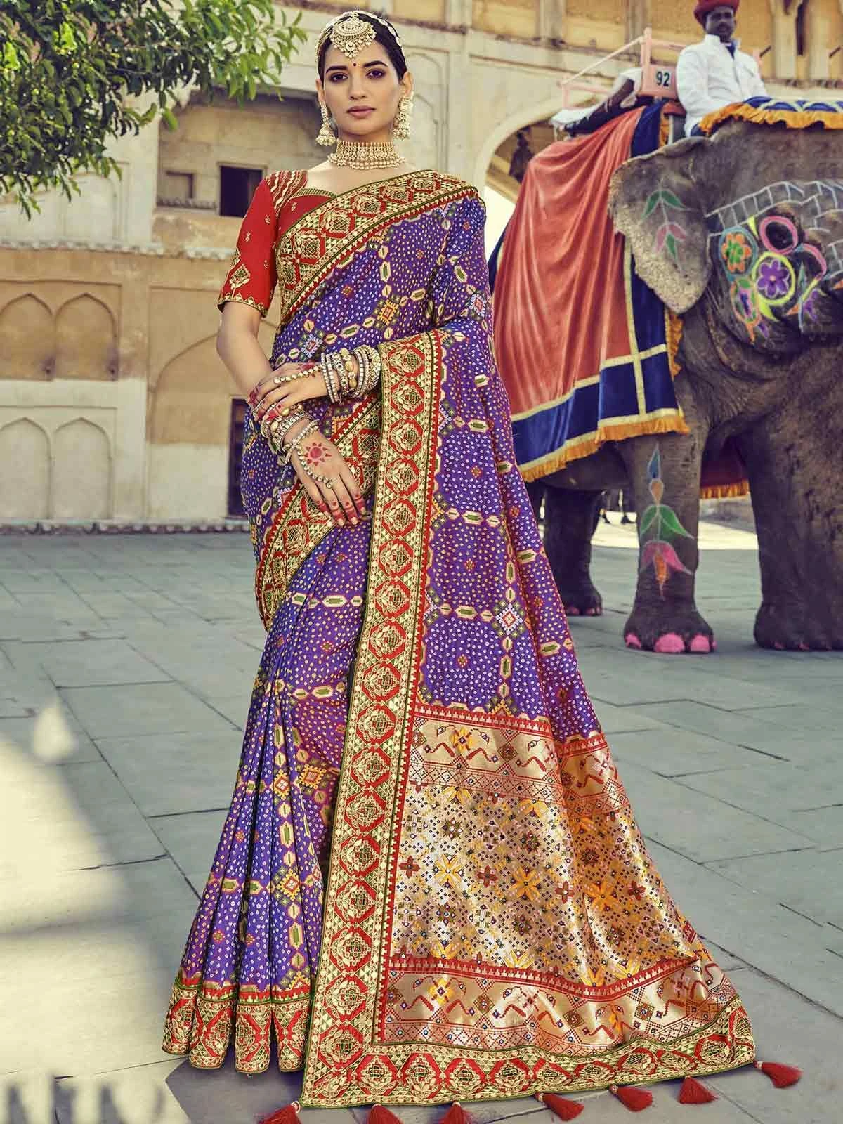 Add grace and charm on your appearance in this gorgeous Blue Colour Patola Silk Fabric Saree. The ethnic Stone,Hand work at the clothing adds a sign of attractiveness statement with your look.