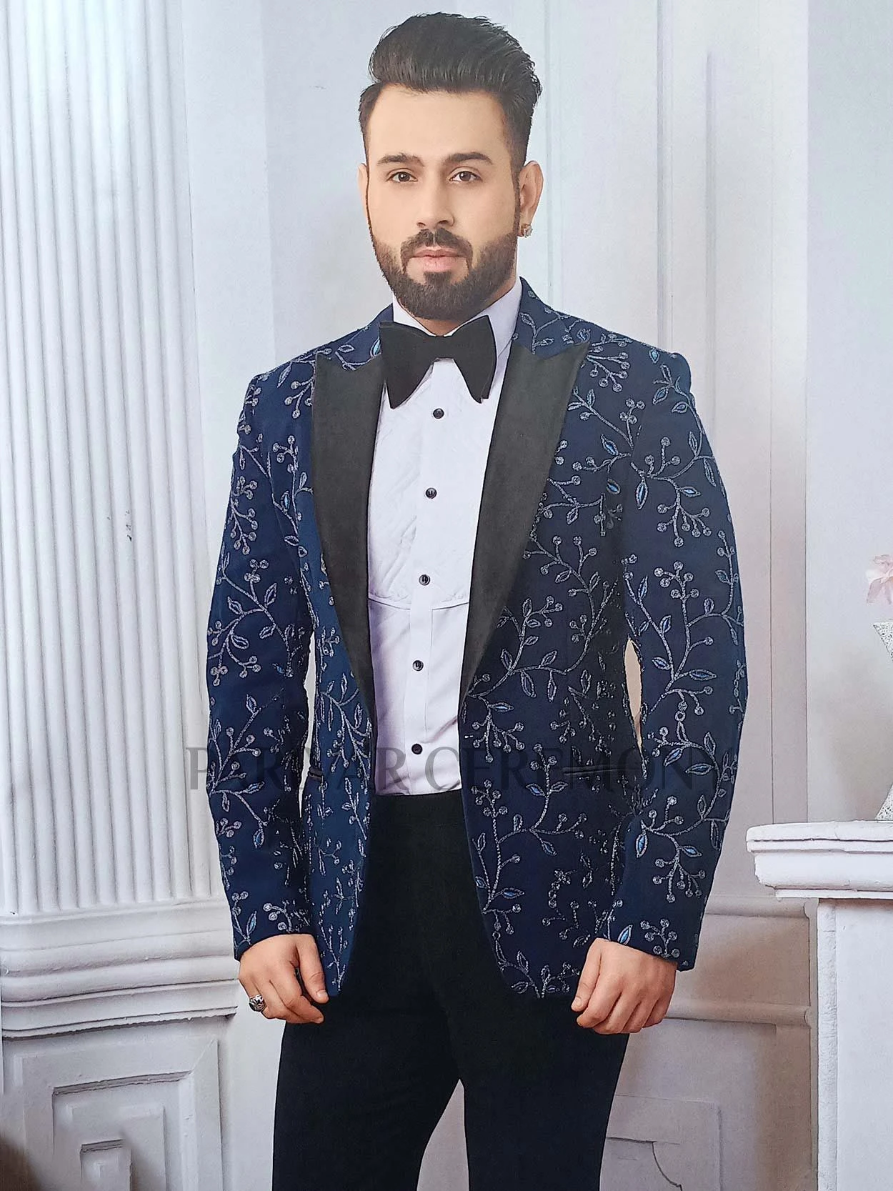 Auspicious Blue Colour Imported Fabric Designer Tuxedo Suit.