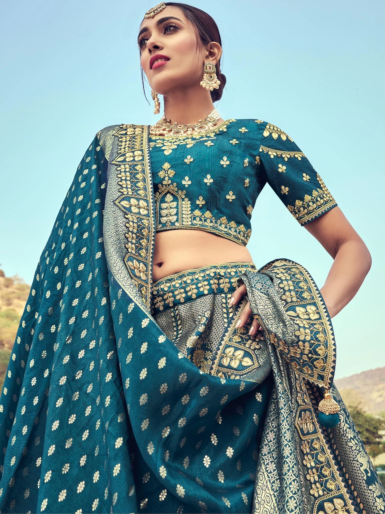 Spread the dazzling sparkles wearing this prussian blue color designer lehenga in silk. Enhanced with zari, stones and thread embroidered work with zari weaving all over. Teamed with similarly embroidered blue color choli and blue dupatta, both made in silk. Note: The accessories featured are purely for fashion purposes. Due to photography reasons, some color variations may occur. The semi-stitched choli and lehenga waist may be customized up to 42 inches.