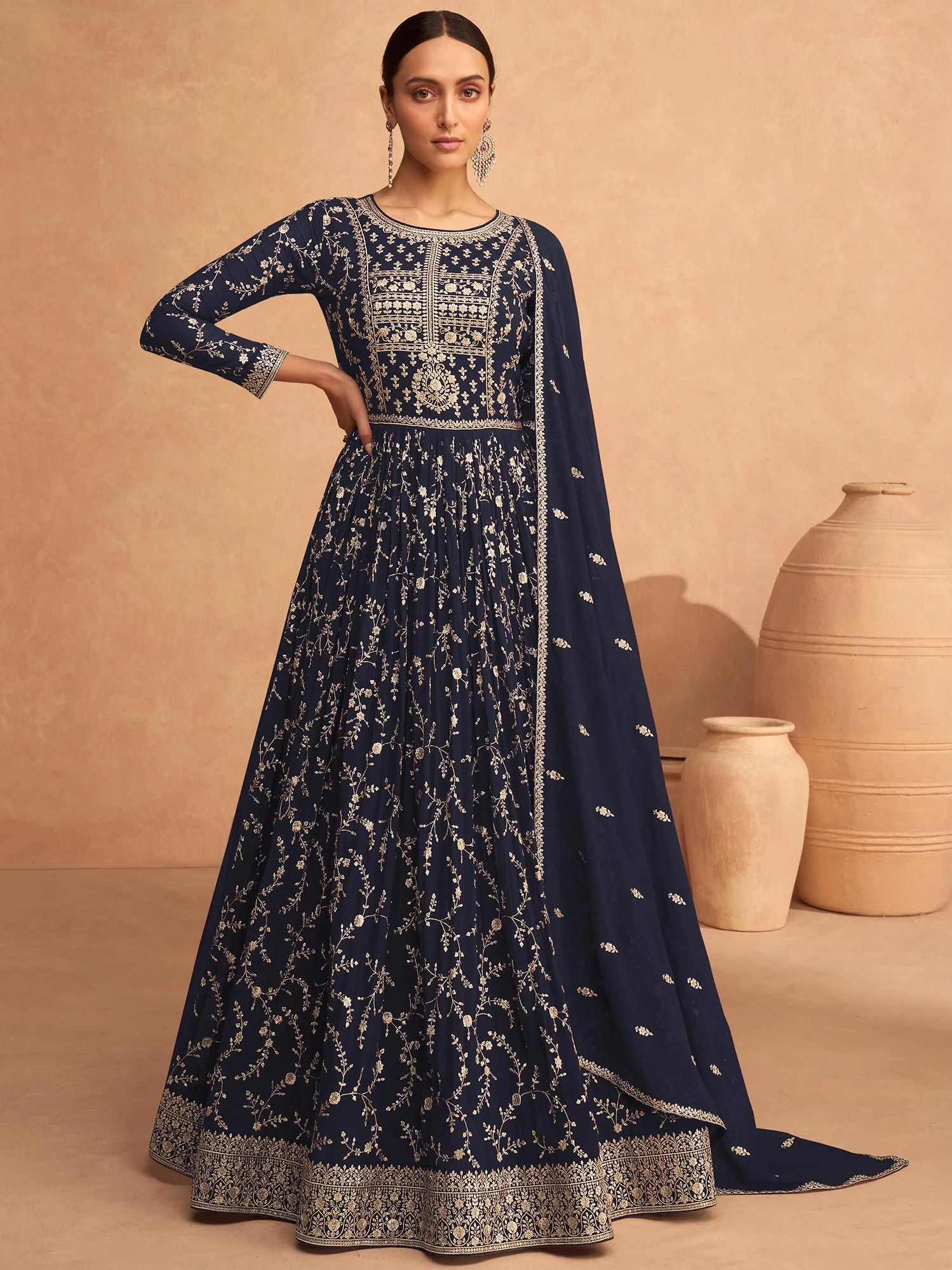 Embrace the ethnicity adorning this deep navy blue color anarkali kameez in silk. Decorated using sequins and zari work embroidery all over. Teamed with a blue embroidered dupatta in georgette and a matching bottom in shantoon. Note: Accessories shown are for styling purpose only. Slight color variation may occur due to photographic reasons. The semi-stitched kameez can be customised upto 42 inches.