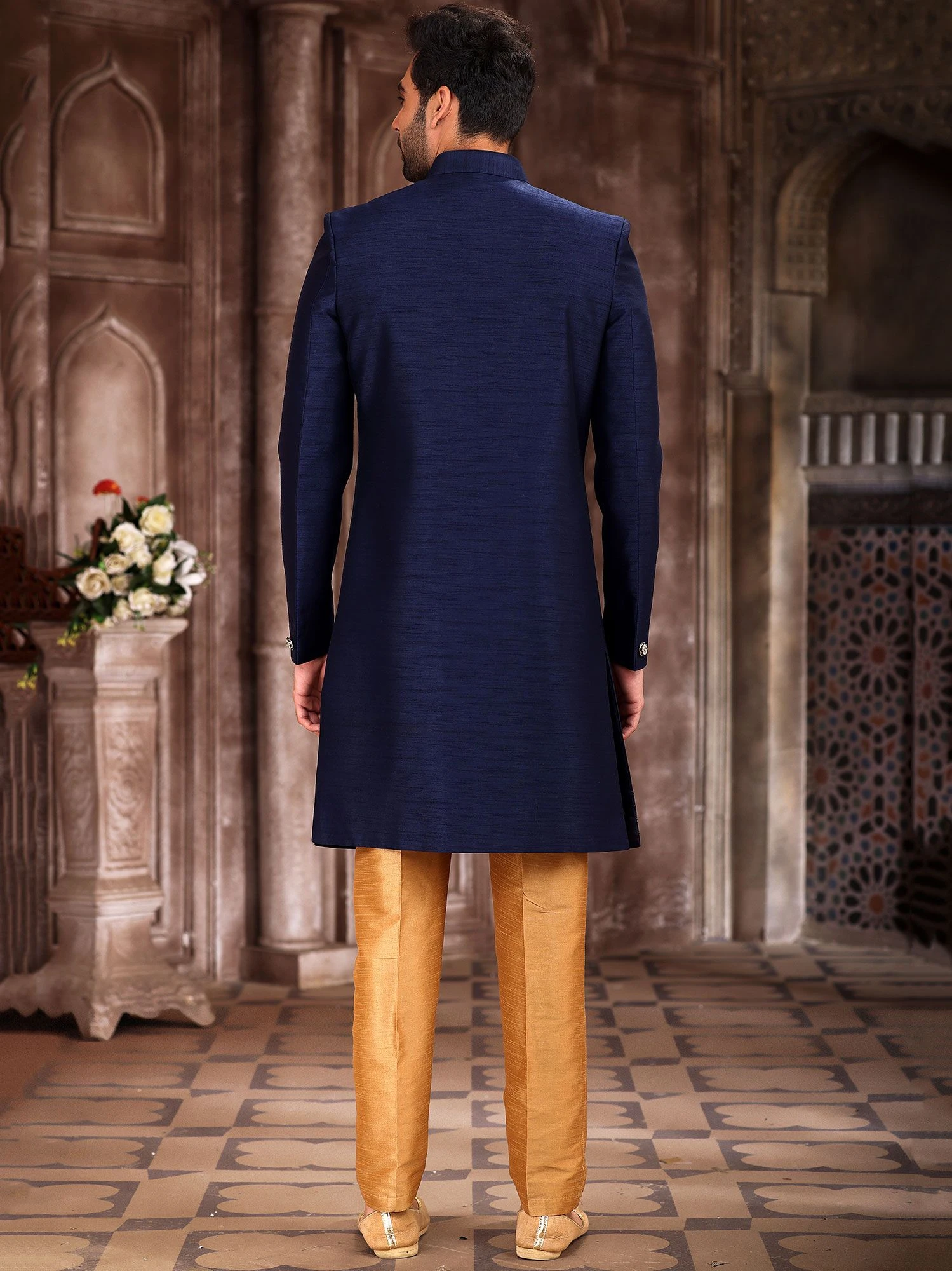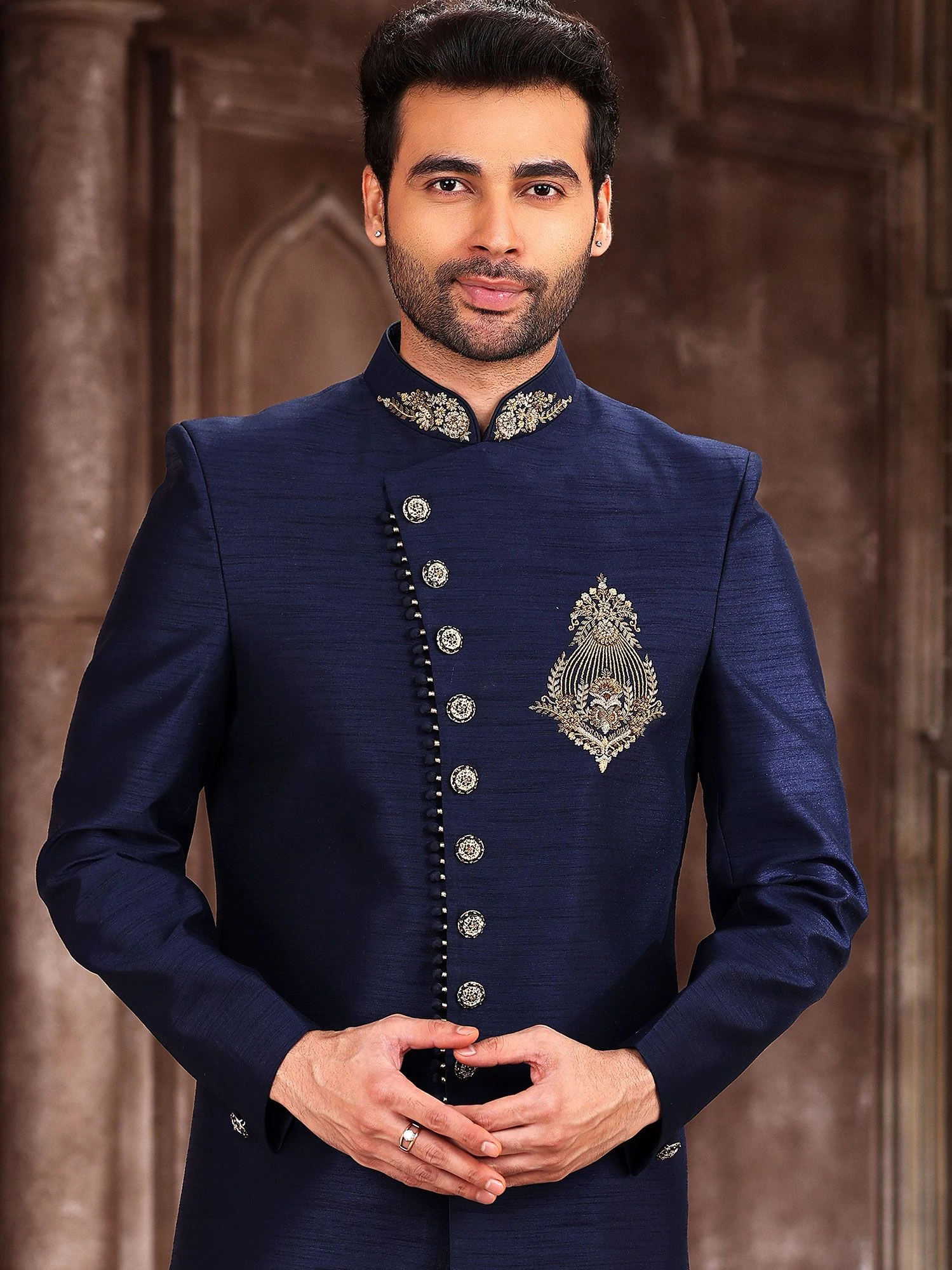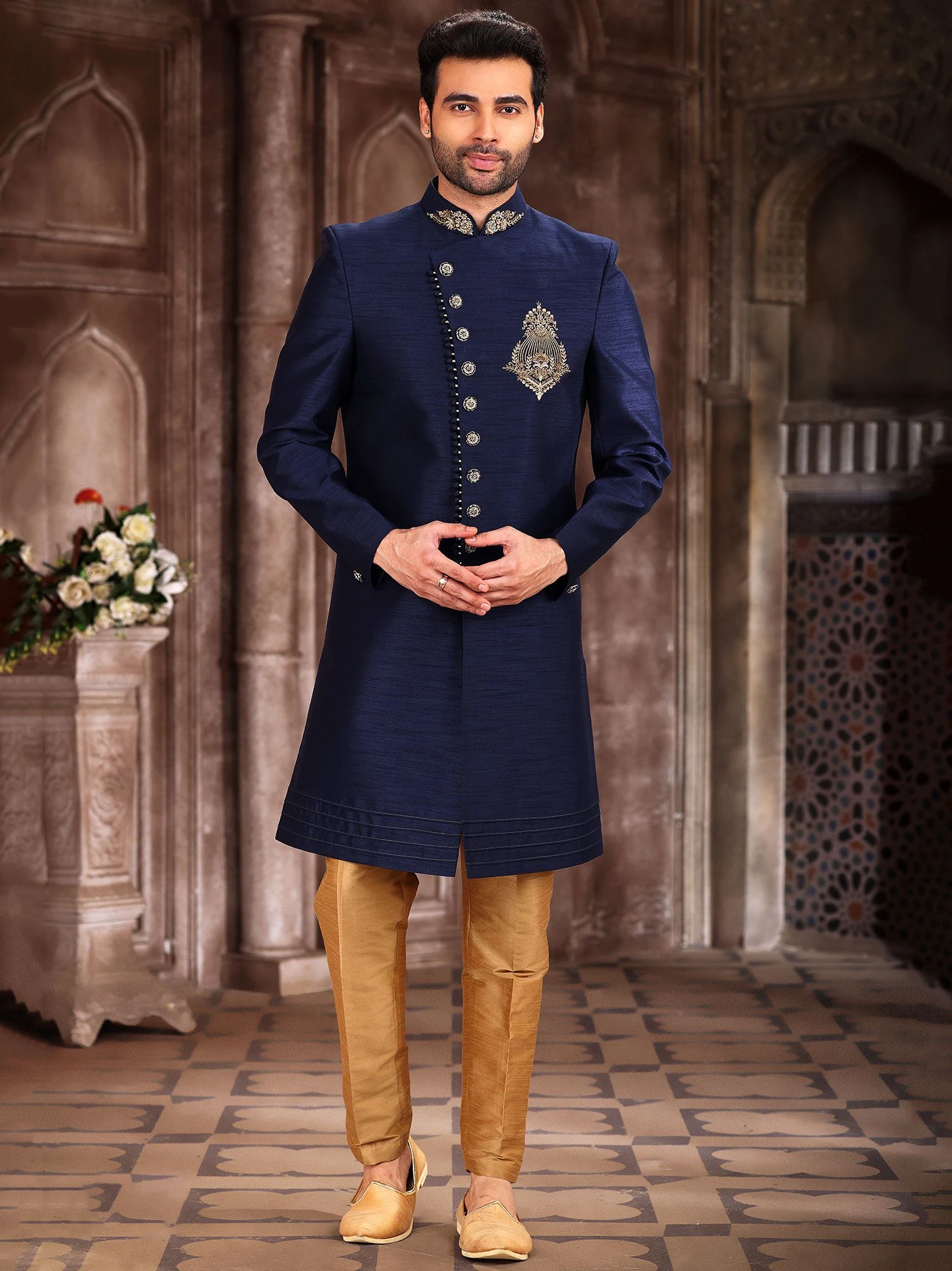 Glam up and shine adorning this deep blue color indo western made in art silk. Decorated with a pocket square, embellished buttons, hand work embroidery work. Teamed with beige color trouser style bottoms in dupion silk. Note: Some color variations may occur owing to photography causes. Up to 1 inch of measurement fluctuation is possible.