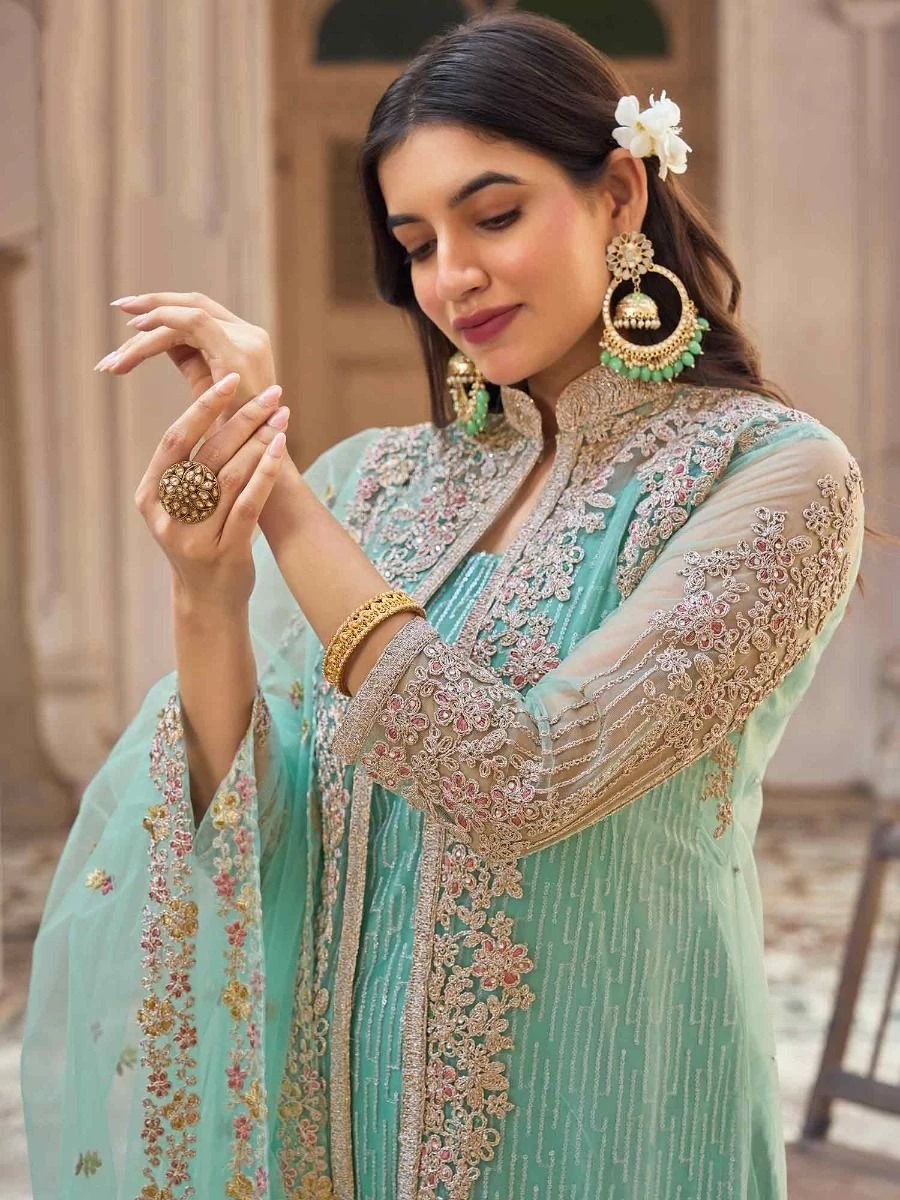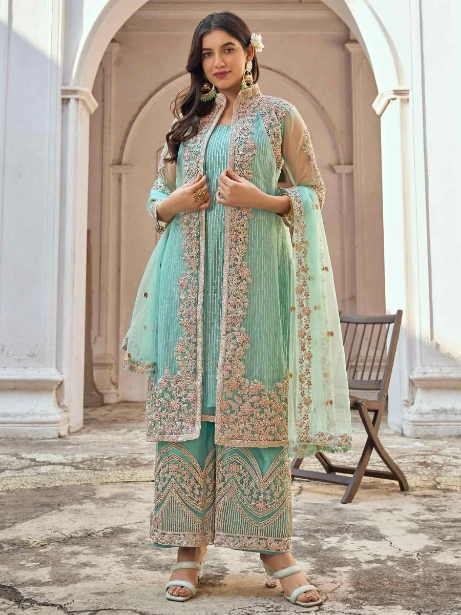 Grab all the attention wearing this sea blue color jacketed kameez made in net. Enhanced using stones, thread, sequins and dori embroidery all over. Comes with a matching net dupatta and a matching palazzo in net with satin liner. Note: Accessories shown are for styling purpose only. Slight color variation may occur due to photographic reasons. The semi-stitched kameez can be customised upto 42 inches.