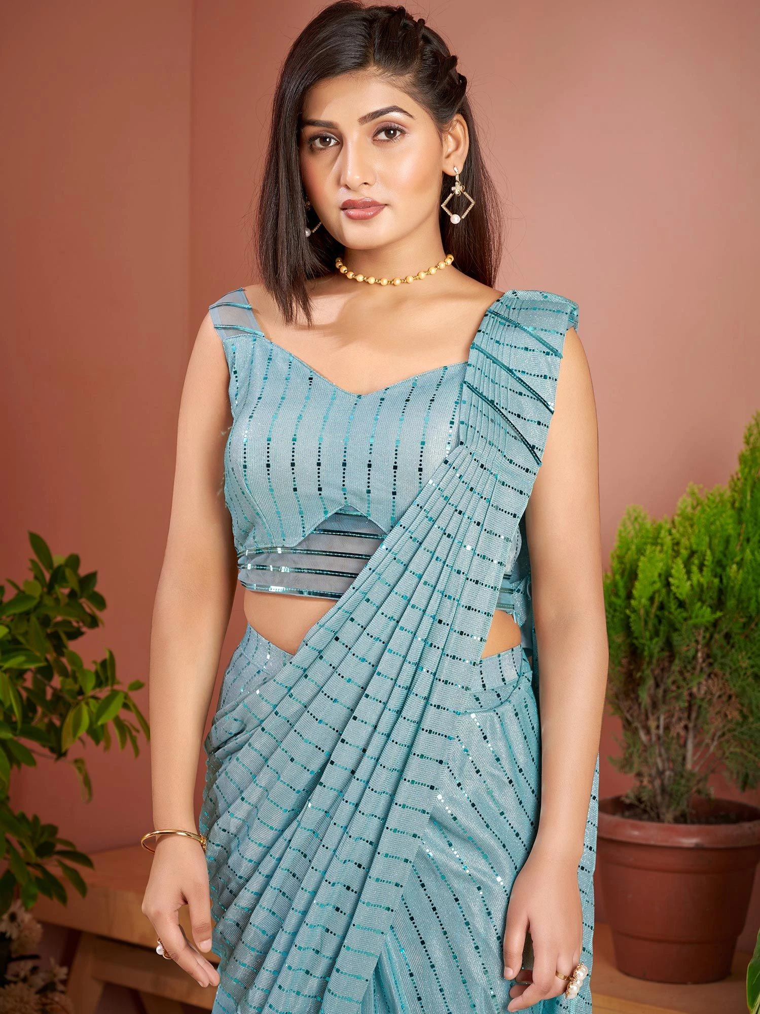 Steal the limelight as you wear this blue color saree crafted in lycra. Designed using sequins and thread embroidered details all over. Comes with a matching blue color embroidered blouse in lycra. Note: The accessories featured are purely for fashion purposes. Due to photography reasons, some color variations may occur. The un-stitched blouse may be customized up to 42 inches.