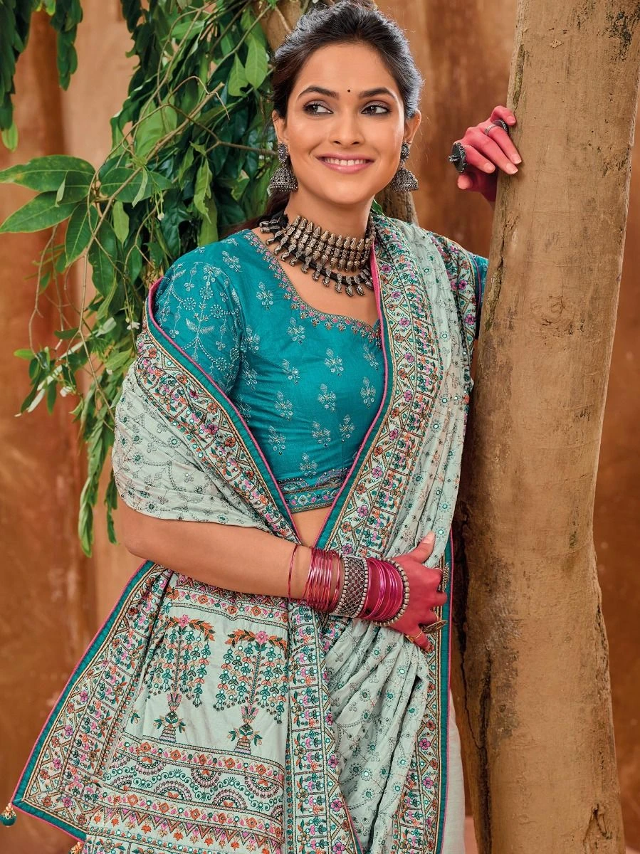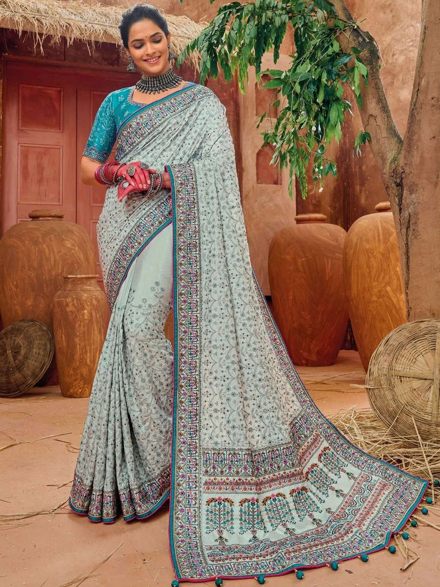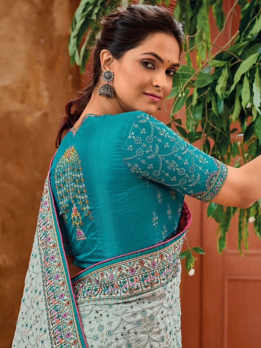 Glam up sweetly wearing this stone blue color saree fabricated in banarasi silk. Designed using stone and thread work embroidery, showcasing distinstive borders and pallu. Comes with a matching blue color embroidered blouse in silk. Note: The accessories featured are purely for fashion purposes. Due to photography reasons, some color variations may occur. The un-stitched blouse may be customized up to 42 inches.