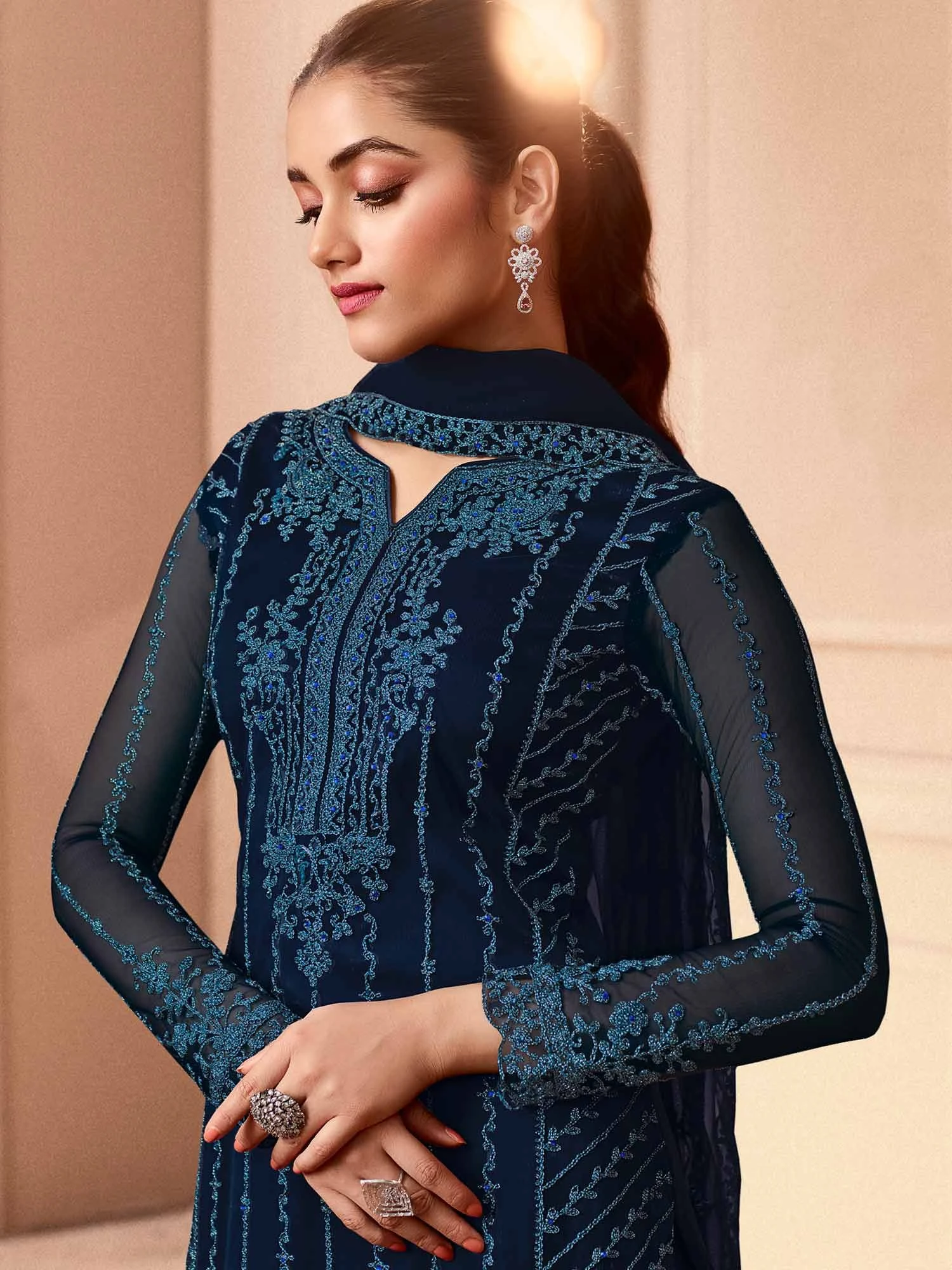 Grab all the compliments wearing this navy blue color staright cut kameez in net. Enhanced with stones and thread embroidery all over. Paired with a matching net dupatta and pants in satin. Note: Accessories shown are for styling purpose only. Slight color variation may occur due to photographic reasons. The semi-stitched kameez can be customised upto 42 inches.