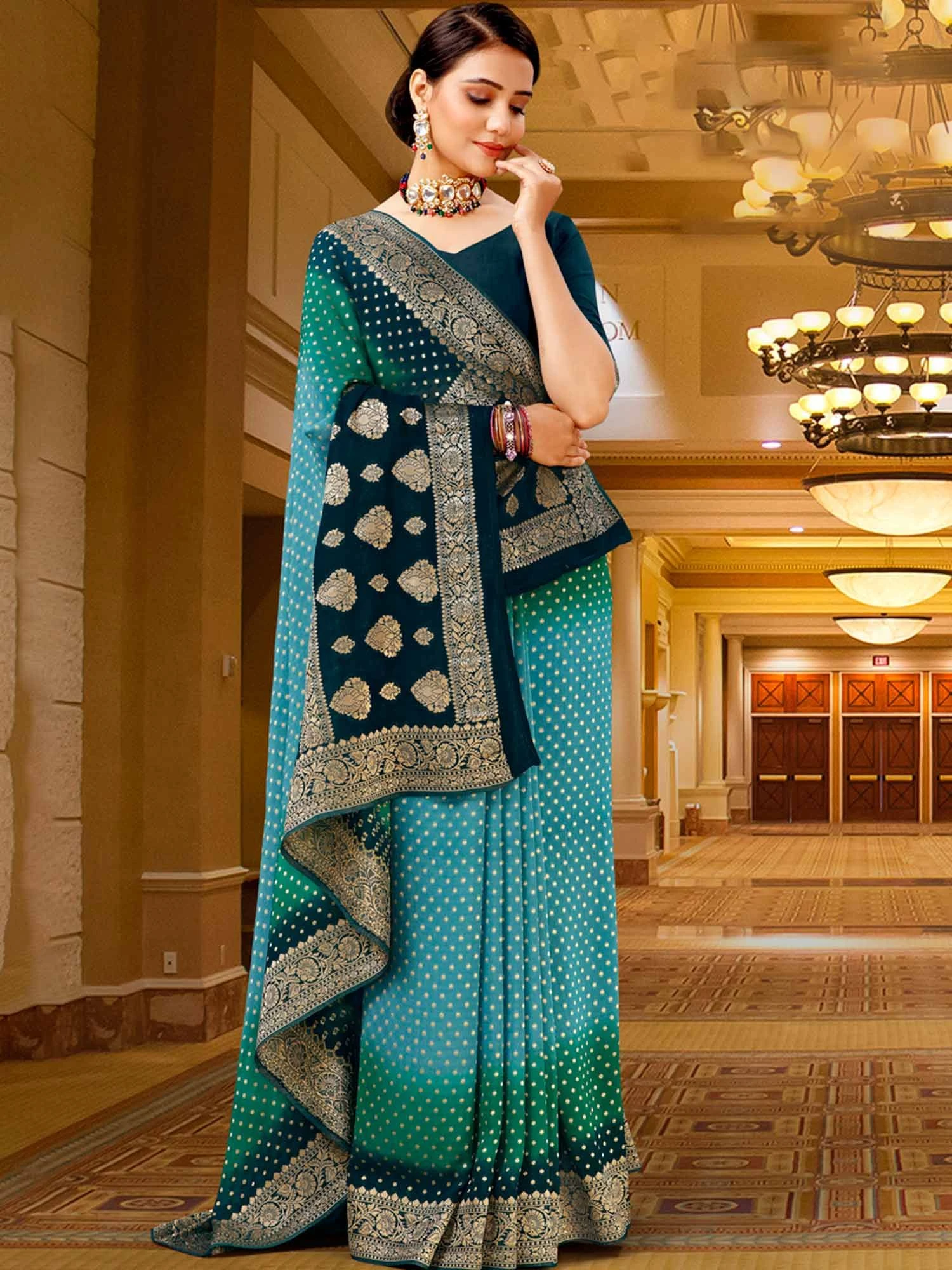 Get your hands on this blue color festive saree crafted in georgette. Augmented using chikankari and woven details. Available with a matching blue color blouse in dupion silk. Note: The accessories featured are purely for fashion purposes. Due to photography reasons, some color variations may occur. The un-stitched blouse may be customized up to 42 inches.