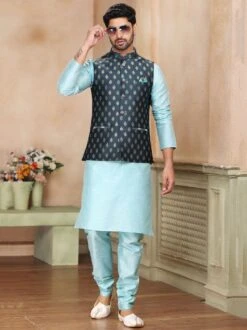 Presenting this powder blue color kurta made in art silk. Topped with a dark blue color jacquard nehru jacket enriched with woven details. Assembled with a blue color churidaar pants in art silk. Note: Some color variations may occur owing to photography causes. Up to 1 inch of measurement fluctuation is possible.