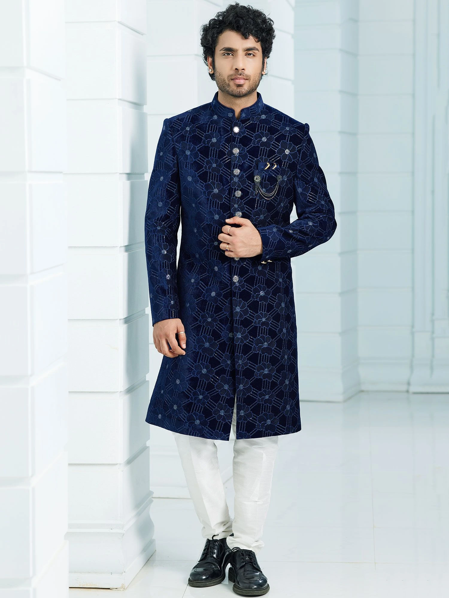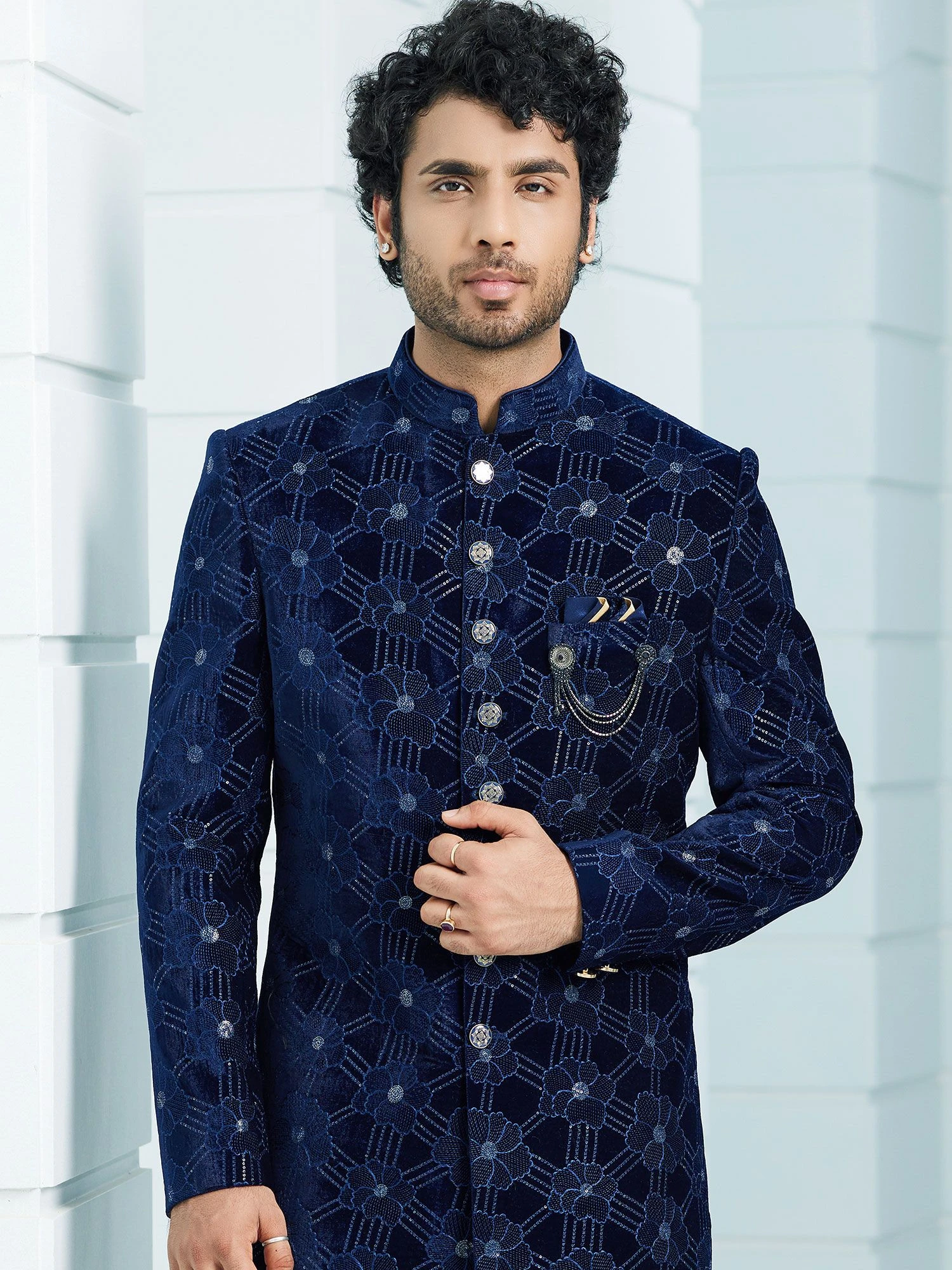 Spread a seamless blend of culture and style adorning this navy blue color indowestern made in silk. Augmented using thread embroidery with floral embellishment work. Paired with white color churidaar in silk. Note: Some color variations may occur owing to photography causes. Up to 1 inch of measurement fluctuation is possible.
