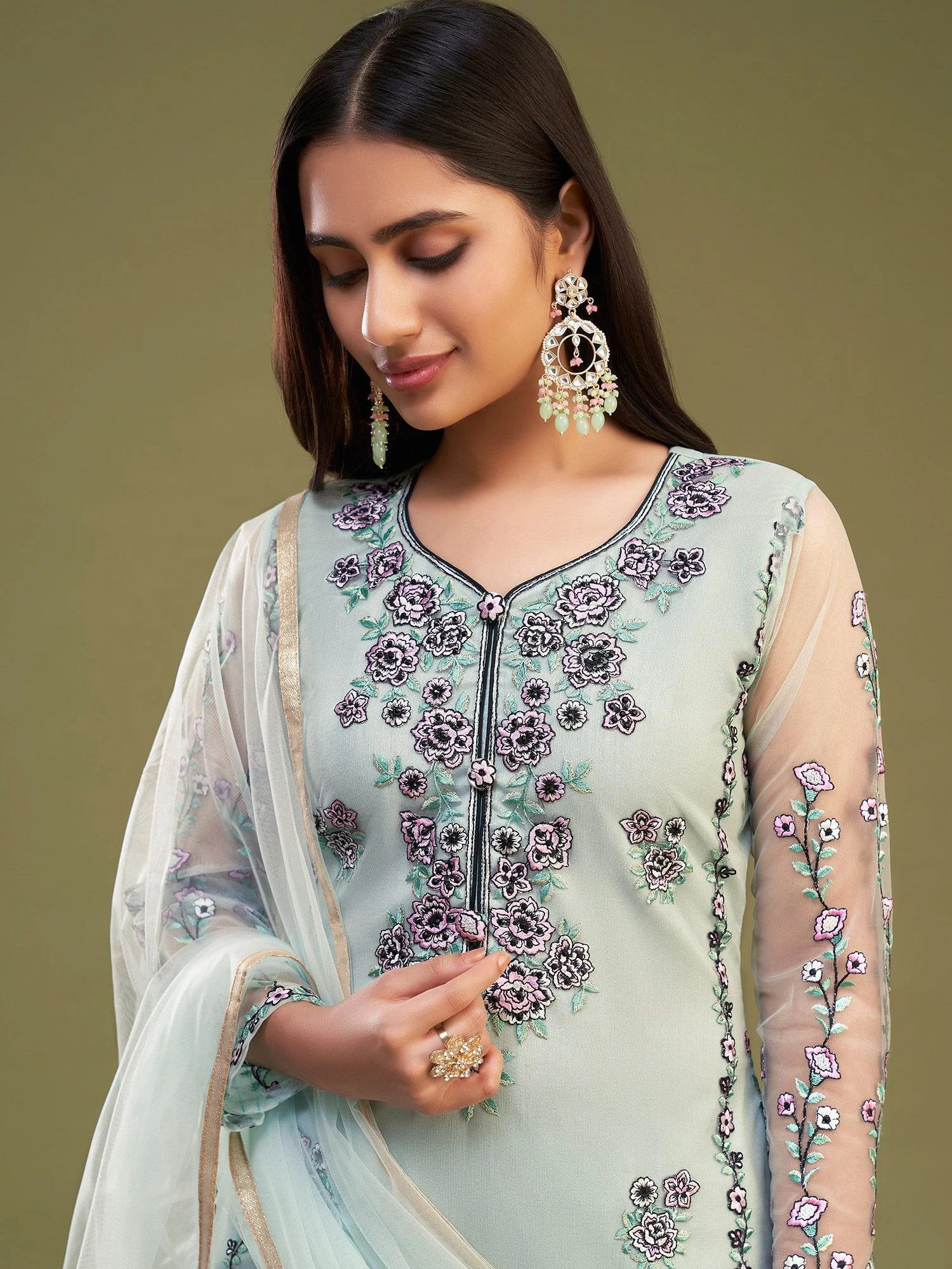 Glam up the views with this stone blue color straight cut kameez in net. Enhanced using thread work and floral embroidery all over. Assigned with a net dupatta and a pant style bottom in banglory silk, both made in blue color. Note: Accessories shown are for styling purpose only. Slight color variation may occur due to photographic reasons. The semi-stitched kameez can be customised upto 42 inches.