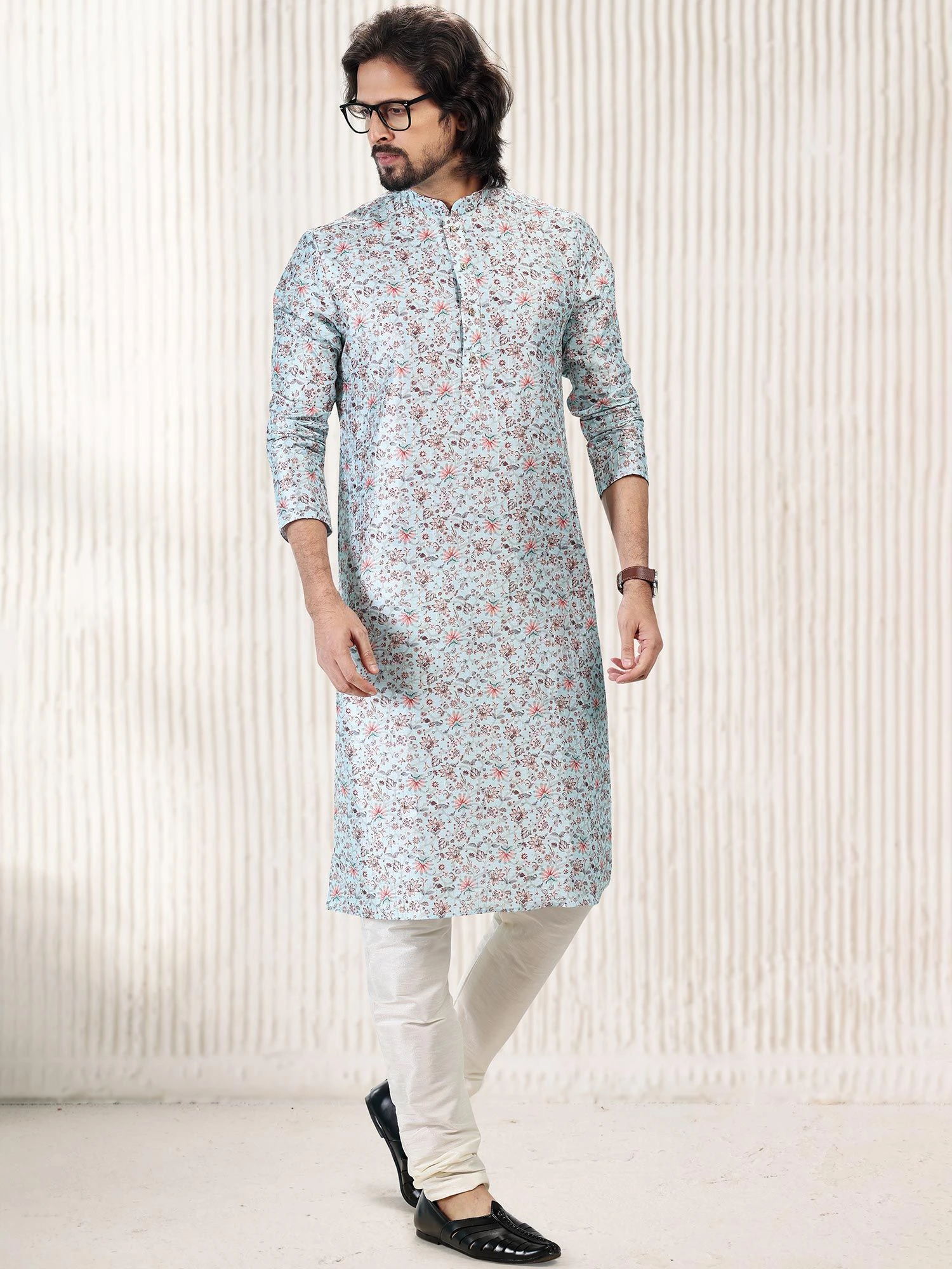 Get a playful look adorning this sky blue color kurta made in banarasi silk. Decked with a floral printed details all over, with potli buttons along the placket. Paired with a white color churidar pants in art silk. Note: Some color variations may occur owing to photography causes. Up to 1 inch of measurement fluctuation is possible.
