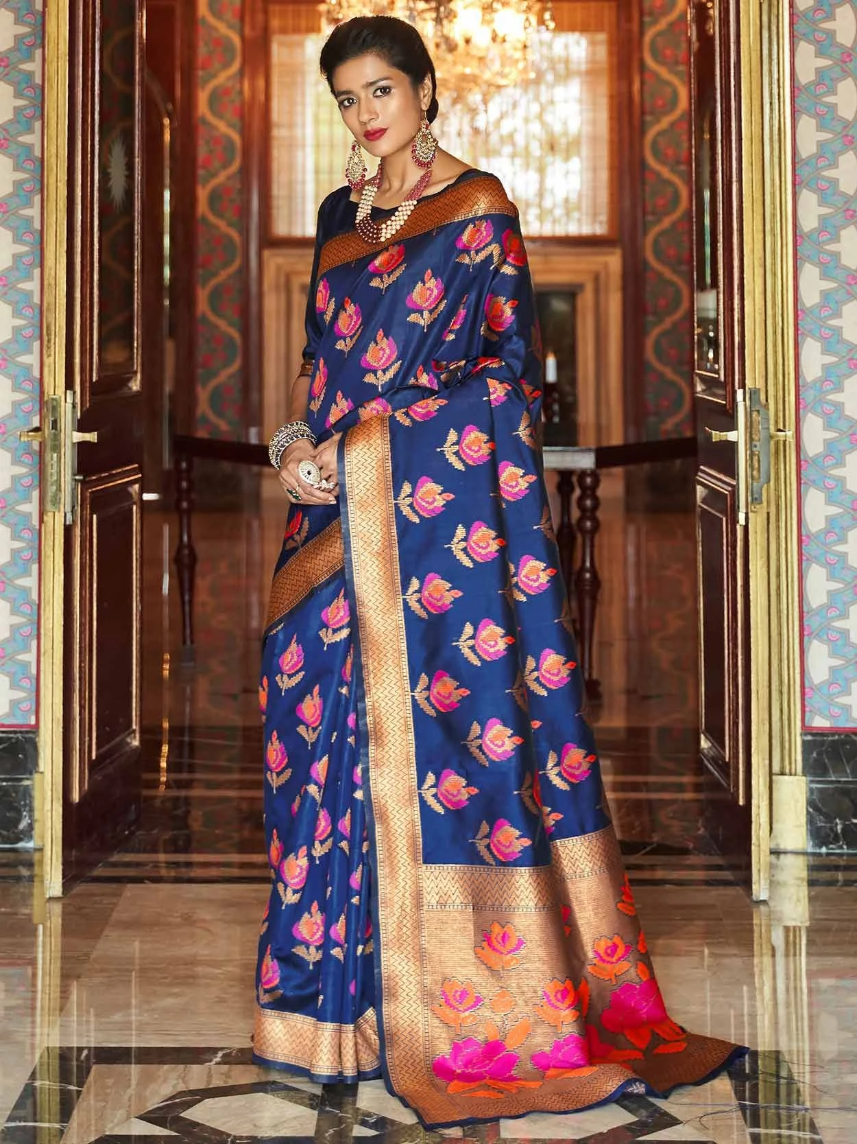 Amp up your festive look adorning this navy blue color festive saree crafted in handloom silk. Augmented using floral woven patterns, showcasing distinstive borders and pallu. Comes with a matching navy blue color blouse in silk. Please keep in mind that the accessories featured are purely for fashion purposes. Due to photography reasons, some color variations may occur. The un-stitched blouse may be customized up to 42 inches.