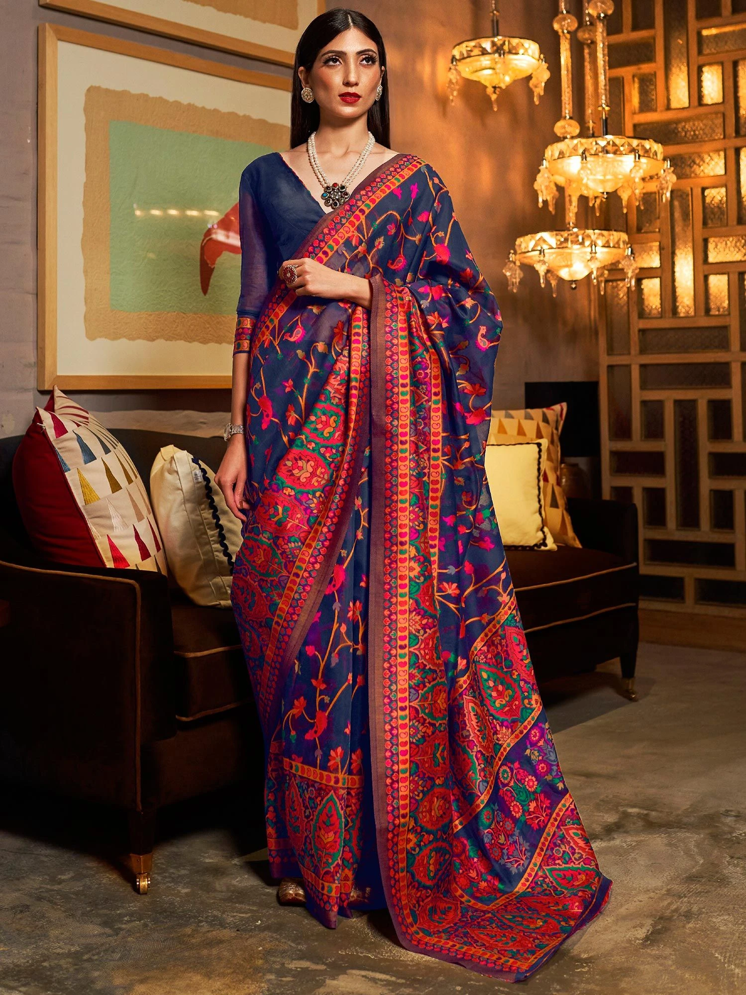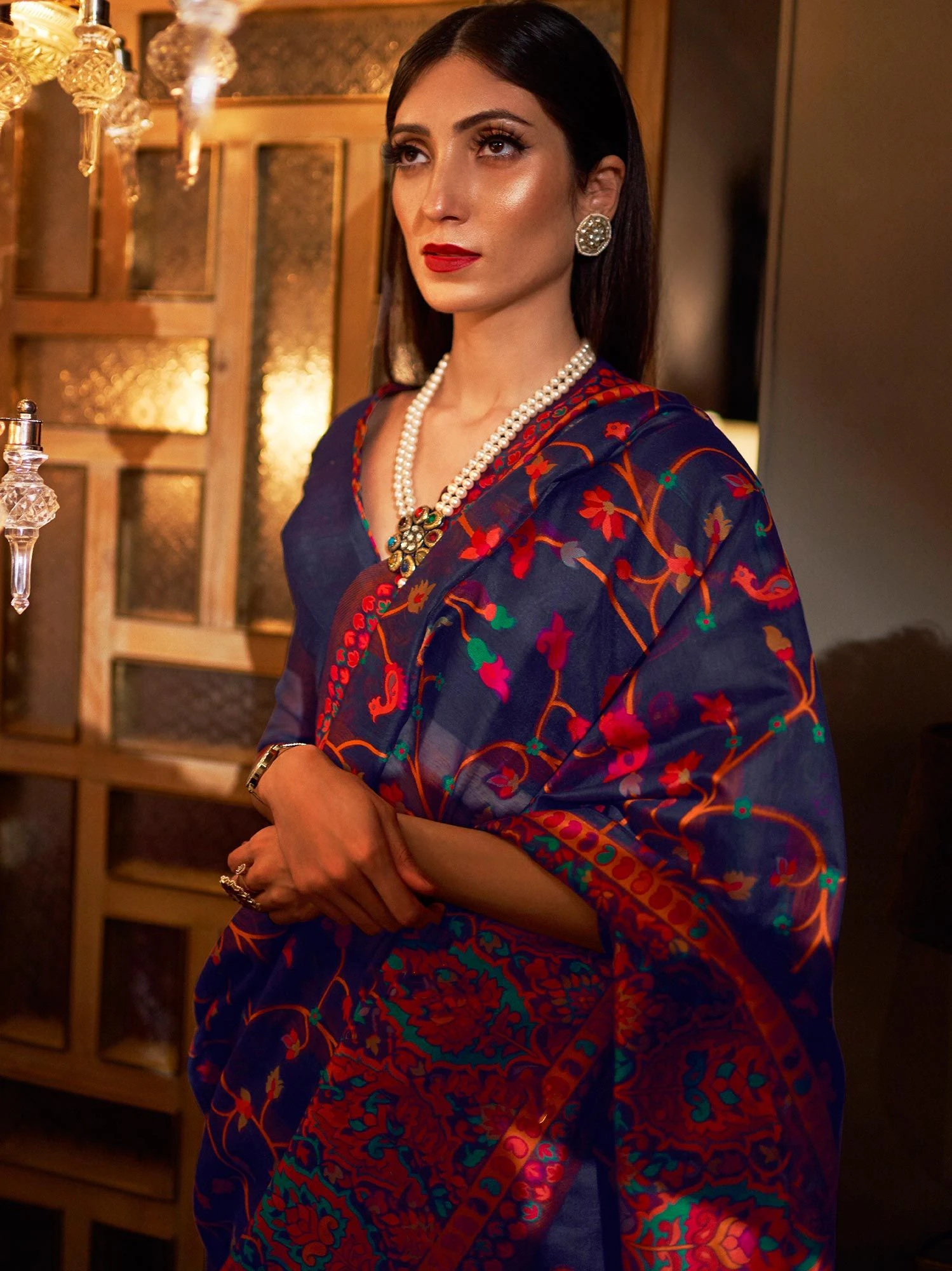 Set yourself a class apart donning in this royal blue color saree crafted in silk. Designed using floral woven patterns with distinstive borders and pallu. Available with a matching blue color blouse in silk. Note: The accessories featured are purely for fashion purposes. Due to photography reasons, some color variations may occur. The un-stitched blouse may be customized up to 42 inches.
