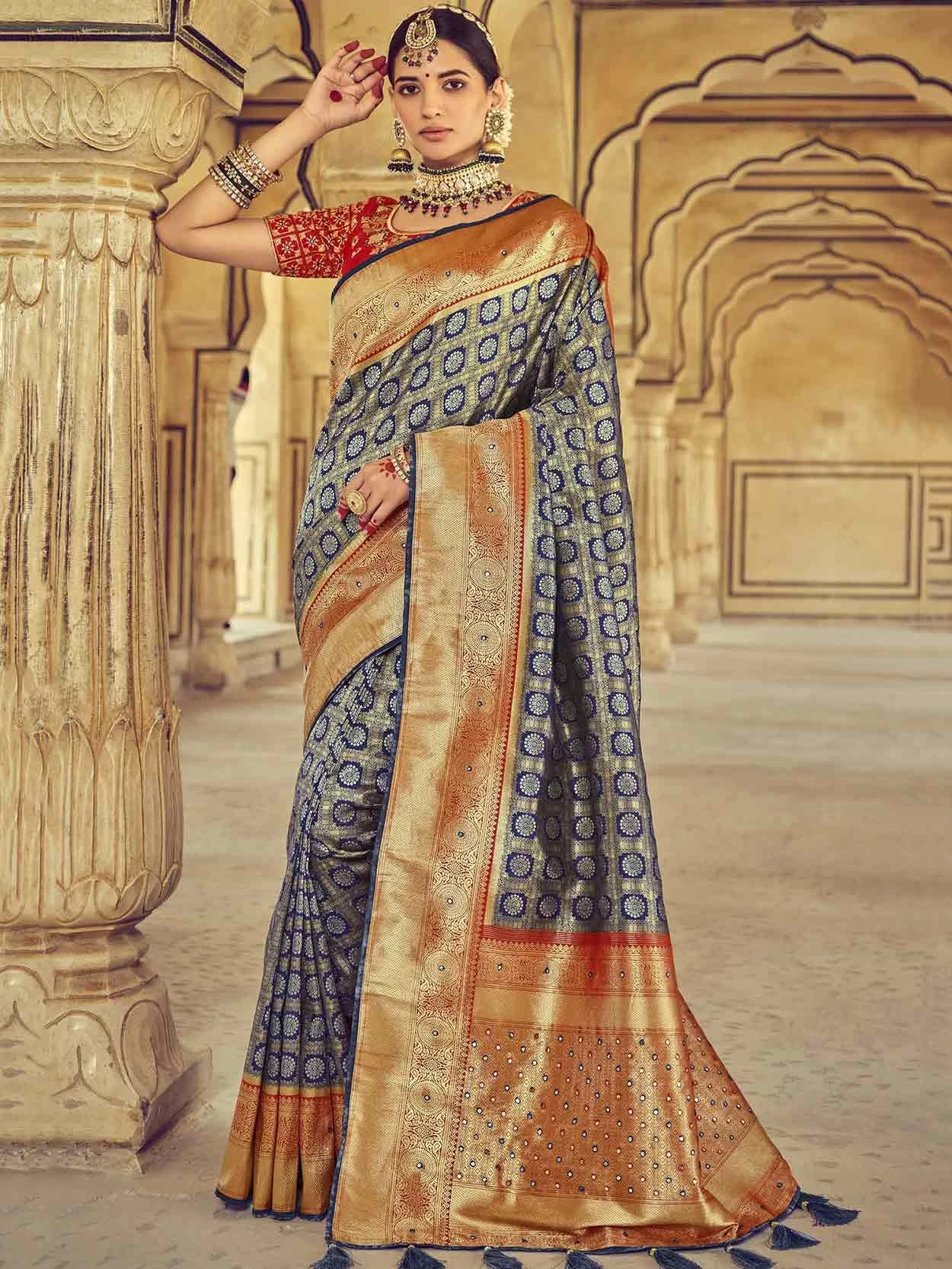 Design and pattern will be at the peak of your magnificence once you dresses this Blue,Golden Colour Kanjivaram Silk Fabric Saree. The ethnic Stone,Hand work at the clothing adds a sign of attractiveness statement with your look.