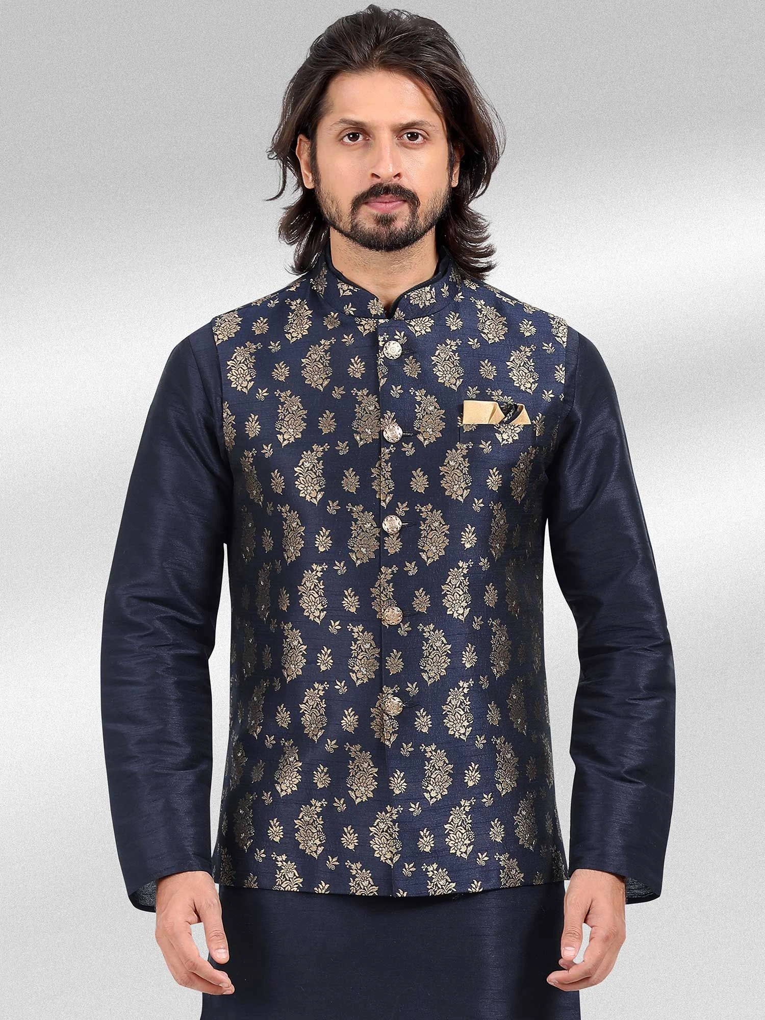 Shine all day sporting this navy blue color kurta made in art silk. Styled using jacquard woven banarasi silk jacket in blue shade. Comes with matching blue color churidaar in art silk. Note: Some color variations may occur owing to photography causes. Up to 1 inch of measurement fluctuation is possible.
