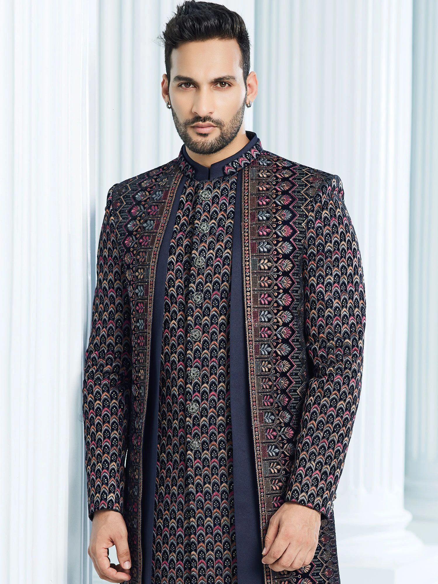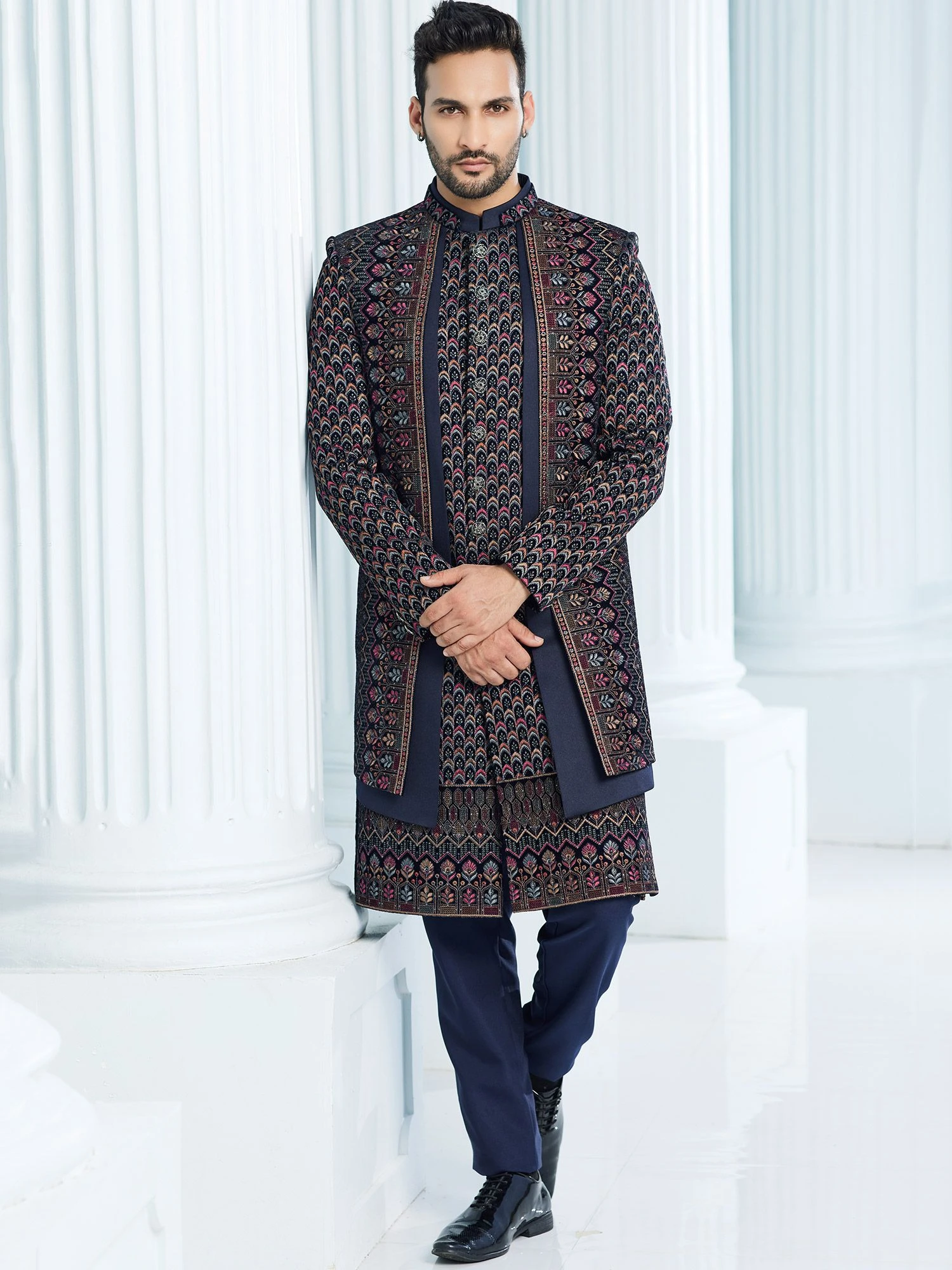 Spreading the sparking vibes with this royal blue color indowestern made in silk. Augmented using thread embroidery with sequins embellishment work. Paired with blue color churidaar in silk. Note: Some color variations may occur owing to photography causes. Up to 1 inch of measurement fluctuation is possible.