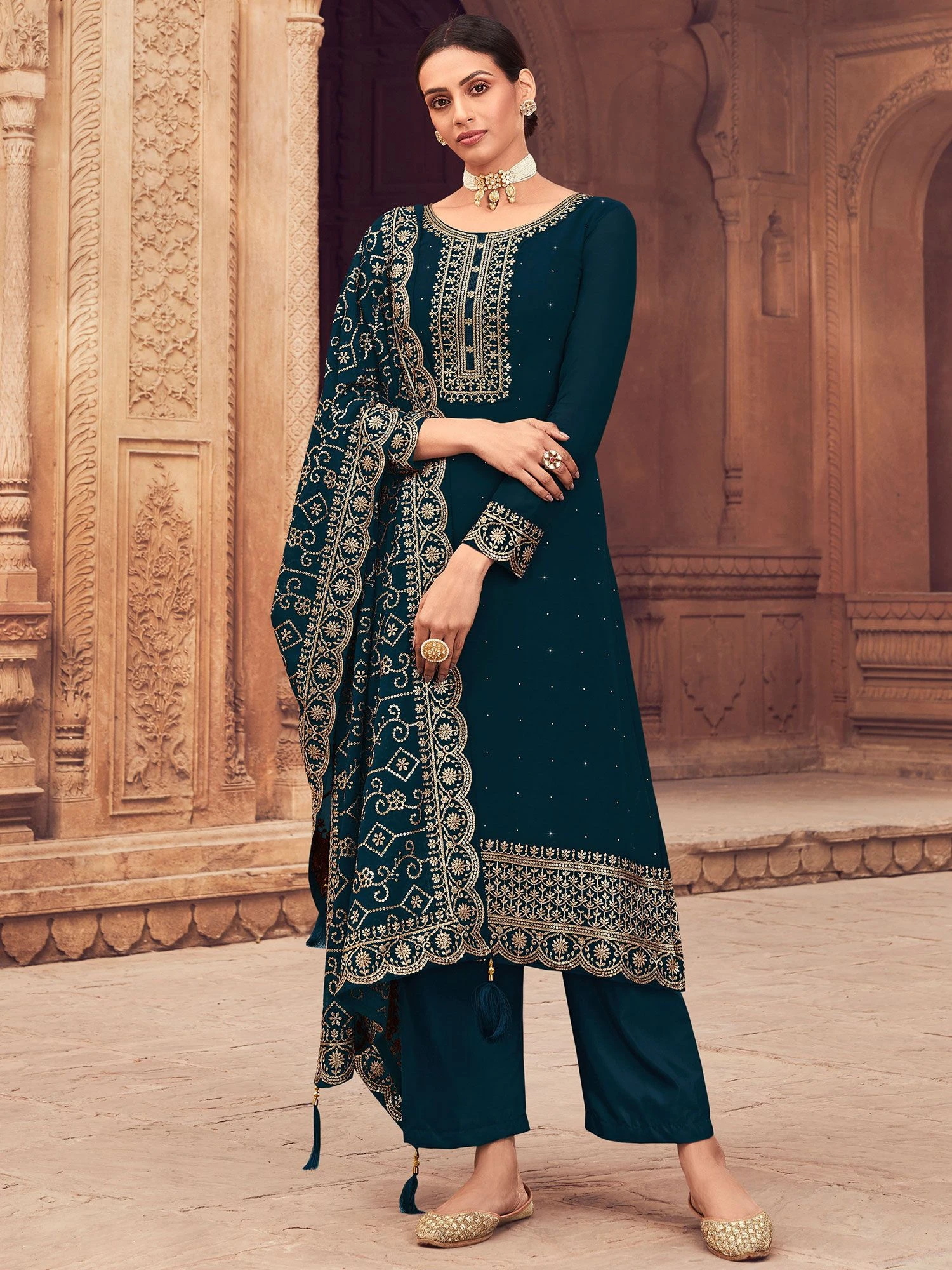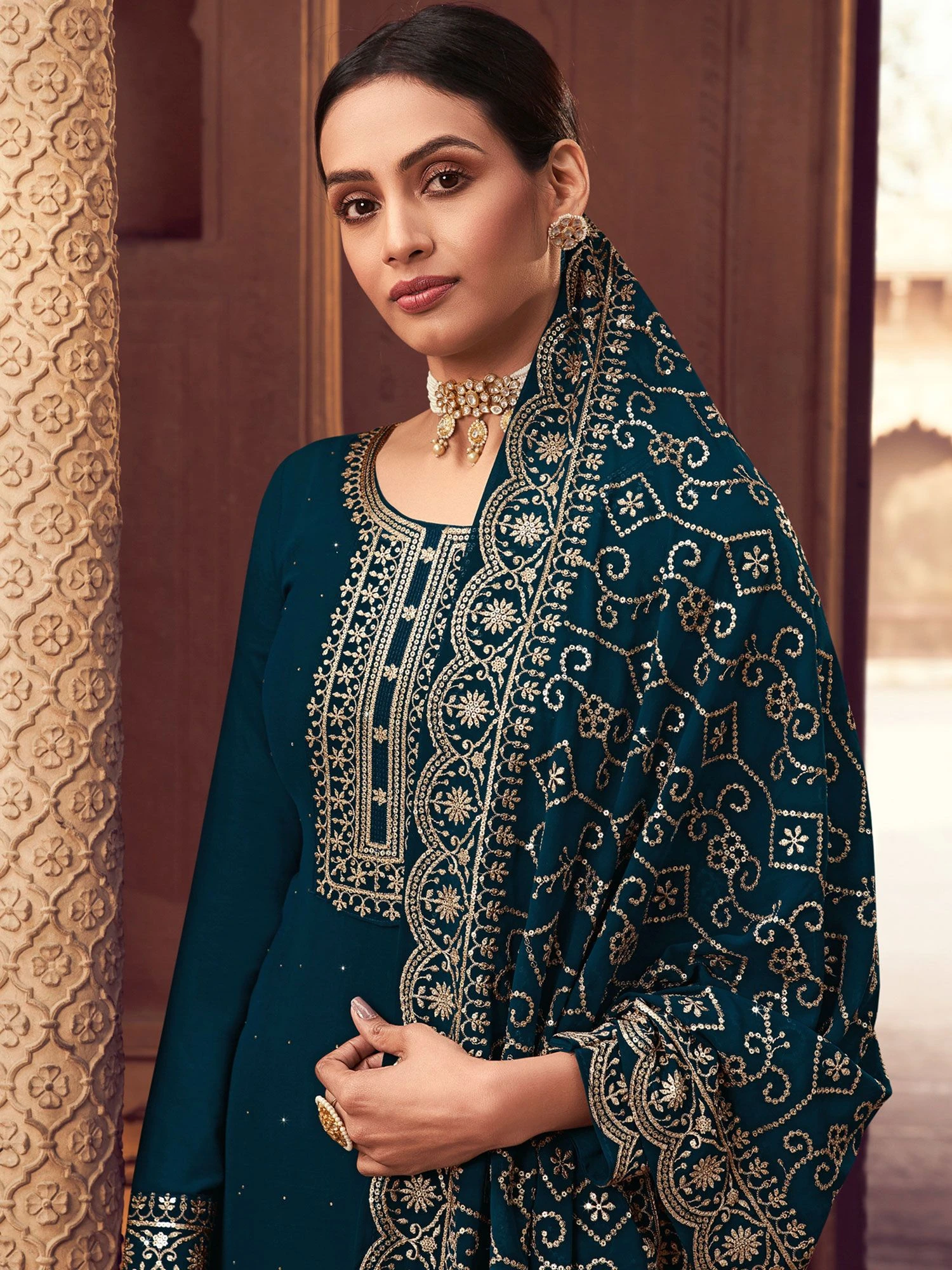 Cherish Your look with this peacock blue color straight cut kameez in georgette. Augmented using sequins and thread work embroidery all over. Assigned with a georgette embroidered dupatta and a palazzo style bottom, both blue in yellow color. Note: Accessories shown are for styling purpose only. Slight color variation may occur due to photographic reasons. The semi-stitched kameez can be customised upto 42 inches.