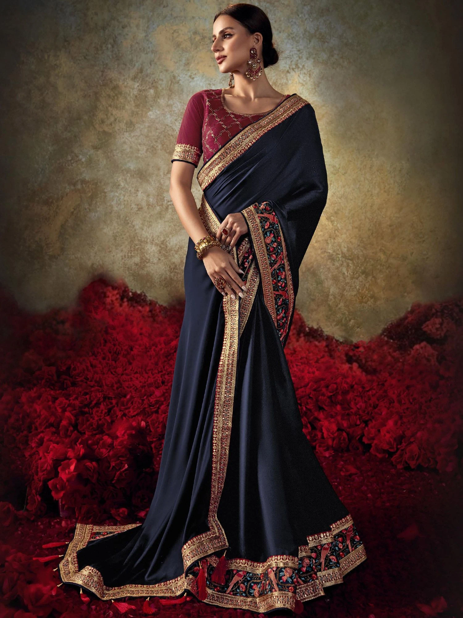 Elegance and beauty come together in this denim blue color saree crafted in art silk. Enhanced using sequins, zari work and embroidered bordered, displaying unique borders and pallu. Comes with a matching dark red color blouse in art silk. Note: The accessories featured are purely for fashion purposes. Due to photography reasons, some color variations may occur. The un-stitched blouse may be customized up to 42 inches.