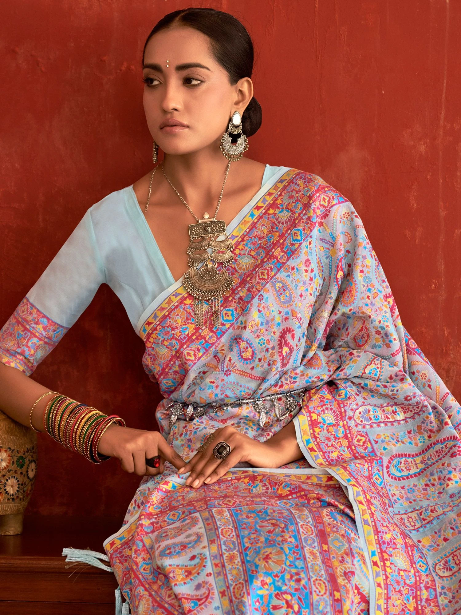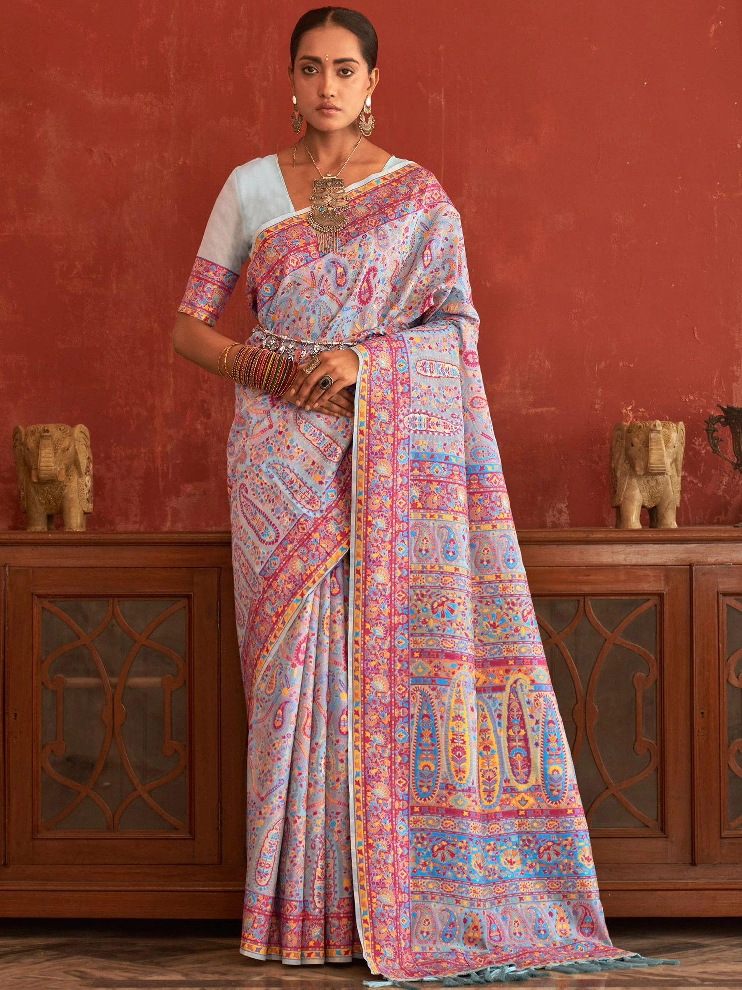 Step into the spotlight as you wear this sky blue color saree made in pashmina silk. Elevated using floral woven patterns all over with tasseled pallu. Comes with a matching sky blue color blouse in pashmina silk. Note: The accessories featured are purely for fashion purposes. Due to photography reasons, some color variations may occur. The un-stitched blouse may be customized up to 42 inches.
