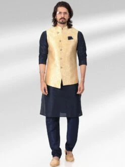 Get your hands on this navy blue color kurta made in art silk. Styled using jacquard woven banarasi silk jacket in cream shade. Teamed with matching blue color churidaar in art silk. Note: Some color variations may occur owing to photography causes. Up to 1 inch of measurement fluctuation is possible.