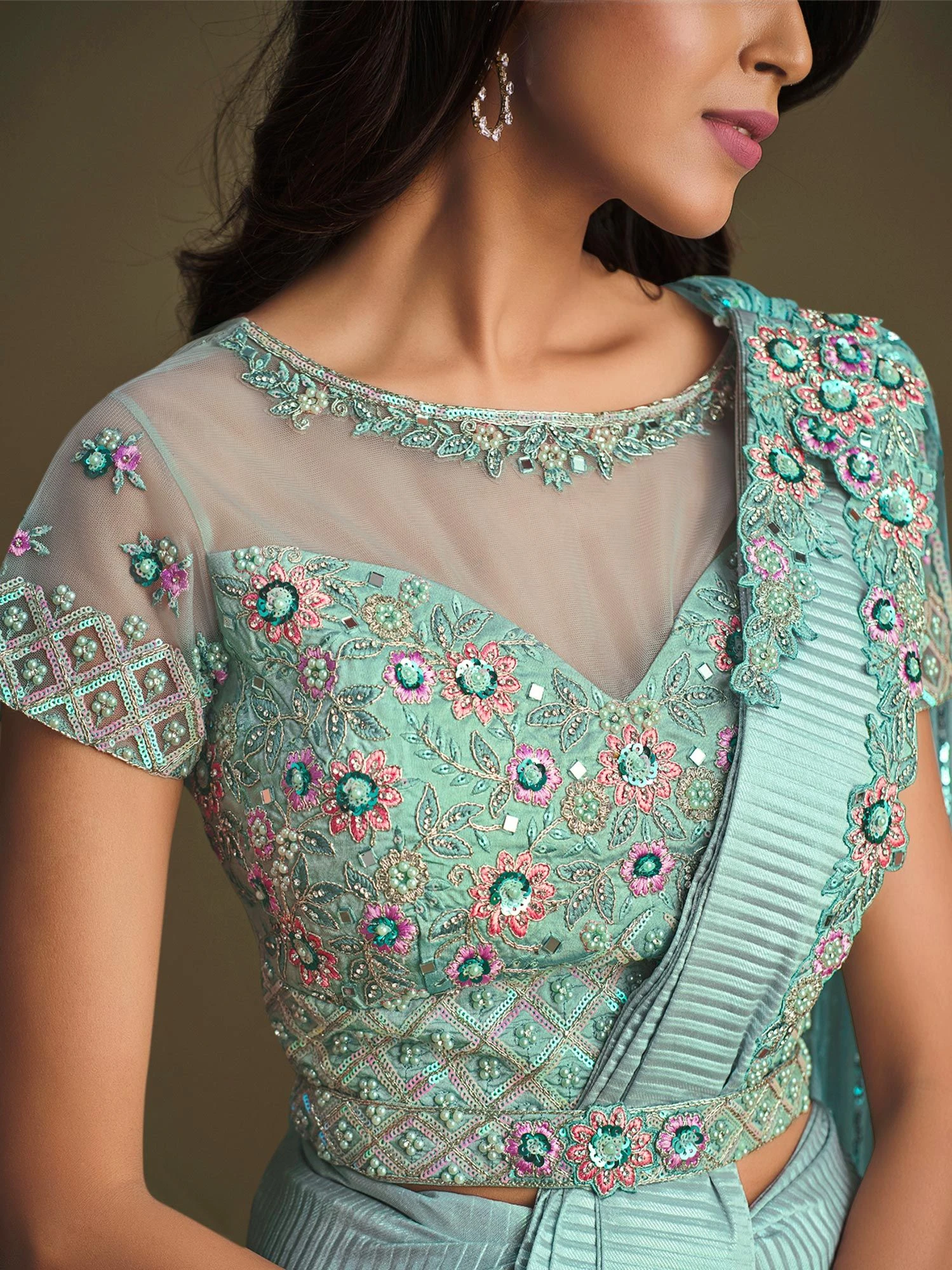 Make a swoon-worthy statement wearing this electric blue color pre-stitched saree in crepe. Decked up using sequins, beads and dori embroidered patterns, showcasing distinstive borders and pallu. Comes with a matching blue color sequined blouse in art silk. Note: The accessories featured are purely for fashion purposes. Due to photography reasons, some color variations may occur. The un-stitched blouse may be customized up to 42 inches.