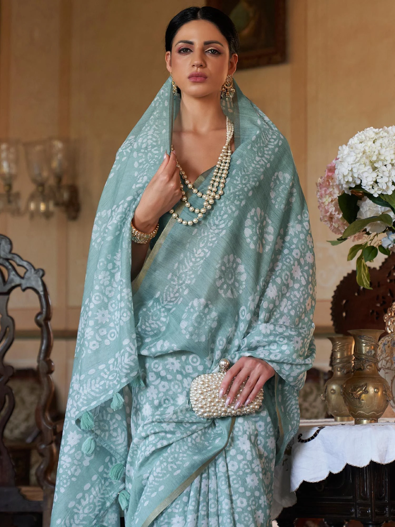 Up your style game wearing this sky blue color saree crafted in cotton. Decoarted using printed patterns all over. Comes with a matching blue color blouse in cotton. Note: The accessories featured are purely for fashion purposes. Due to photography reasons, some color variations may occur. The un-stitched blouse may be customized up to 42 inches.