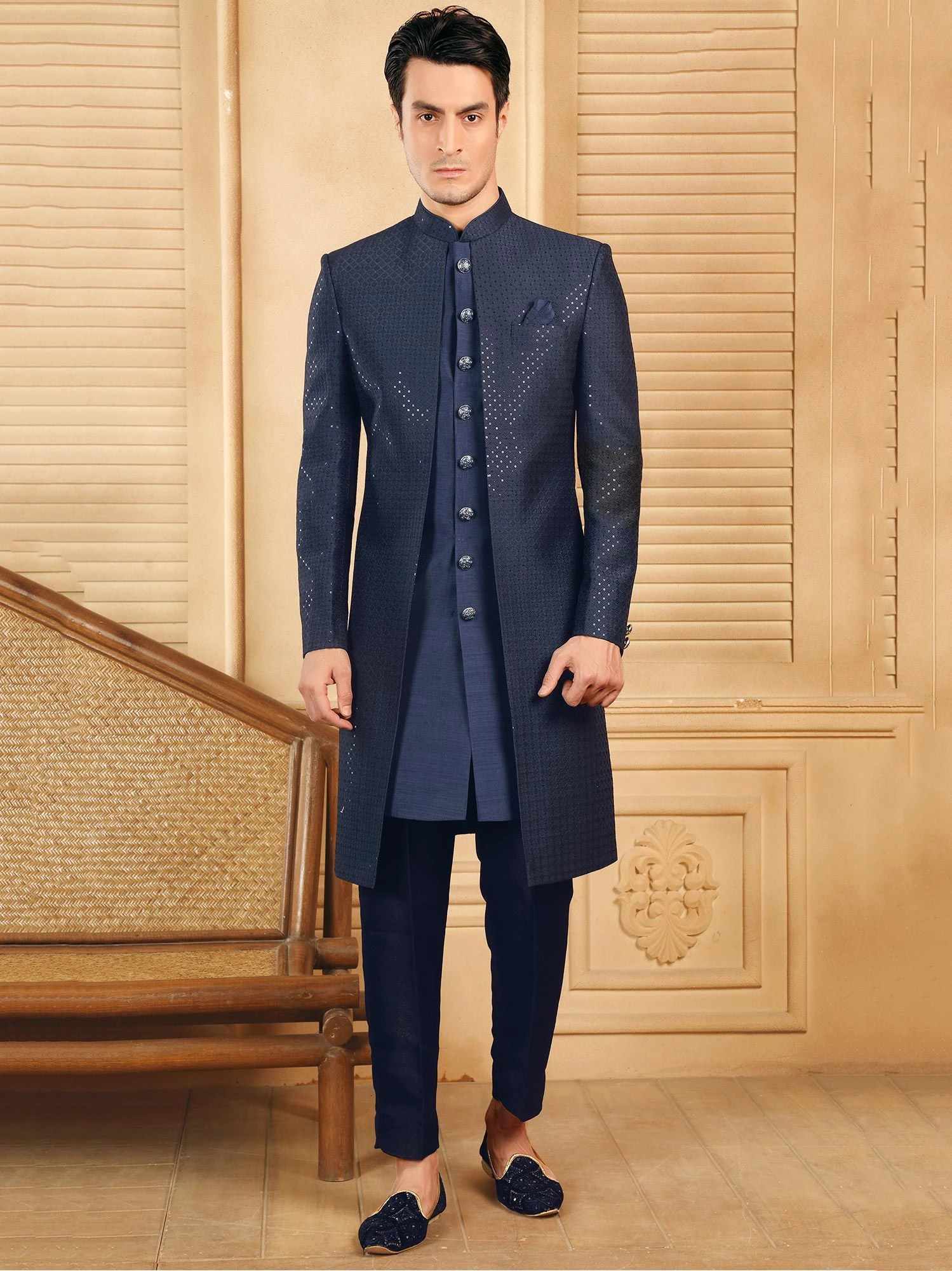 Spread the dazzling effect adorning this dusty blue color indo western made in silk. Designed using thread and sequins work embroidery details all over. Teamed with matching blue color trouser pants in silk. Note: Some color variations may occur owing to photography causes. Up to 1 inch of measurement fluctuation is possible.
