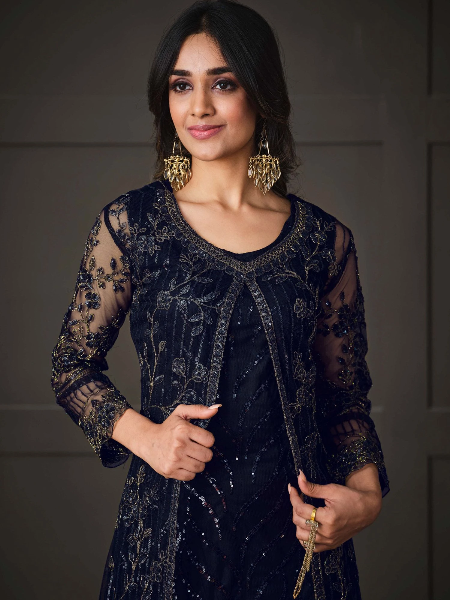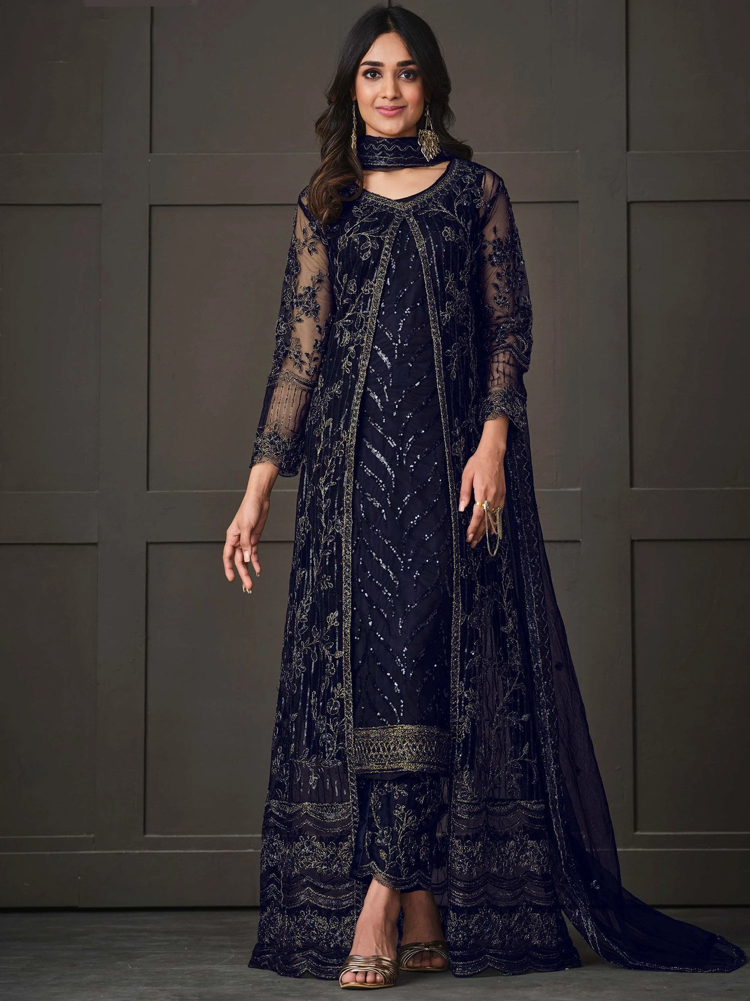 Overwhelm the audience adorning this denim blue color jacket style slitted kameez in net. Crafted using sequins and dori work embroidery all over. Teamed with a blue embroidered dupatta in net and matching pants in satin. Note: Accessories shown are for styling purpose only. Slight color variation may occur due to photographic reasons. The semi-stitched kameez can be customised upto 42 inches.
