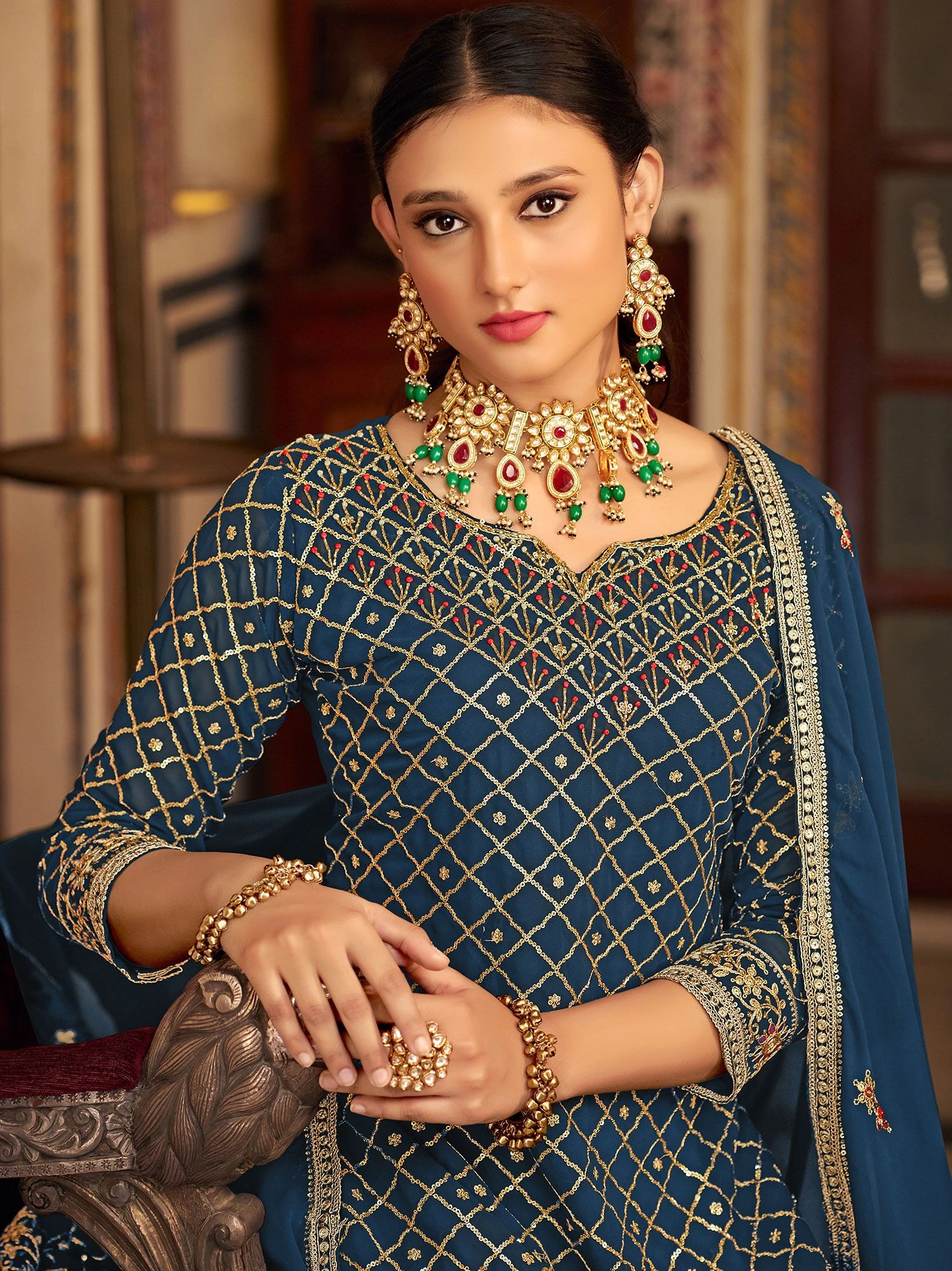 Glam up the views with this peacock blue color straight cut kameez in crepe. Enhanced using sequins and zari work embroidery all over. Assigned with a crepe dupatta and a sharara style bottom, both made in blue color. Note: Accessories shown are for styling purpose only. Slight color variation may occur due to photographic reasons. The semi-stitched kameez can be customised upto 42 inches.