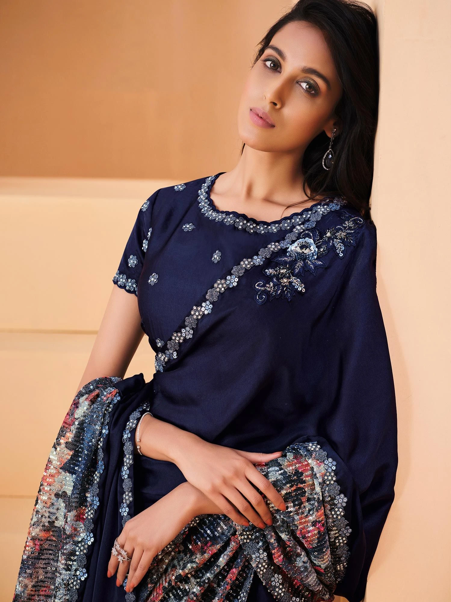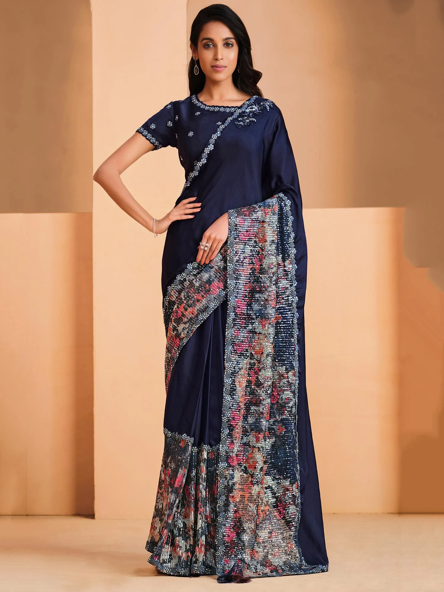 Be the master of steal worthy wearing this satin saree made in denim blue shade. Decortaed using sequins, dori and thread embroidered patterns, showcasing distinstive borders. Teamed with a matching blue color blouse in art silk. Note: The accessories featured are purely for fashion purposes. Due to photography reasons, some color variations may occur. The un-stitched blouse may be customized up to 42 inches.