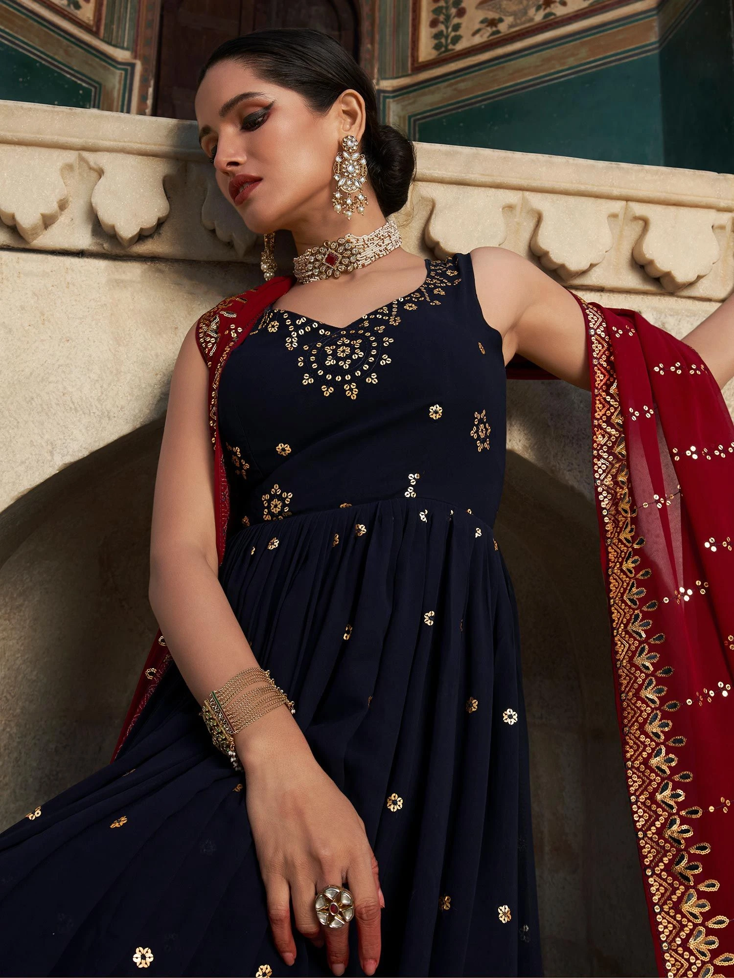 Stand apart from the crowd wearing this dark blue color anarkali kameez in georgette. Enhanced using sequins and thread work embroidery all over. Teamed with a maroon color embroidered dupatta in georgette. Note: Accessories shown are for styling purpose only. Slight color variation may occur due to photographic reasons. The semi-stitched kameez can be customised upto 42 inches. The suit does not come with a bottom.