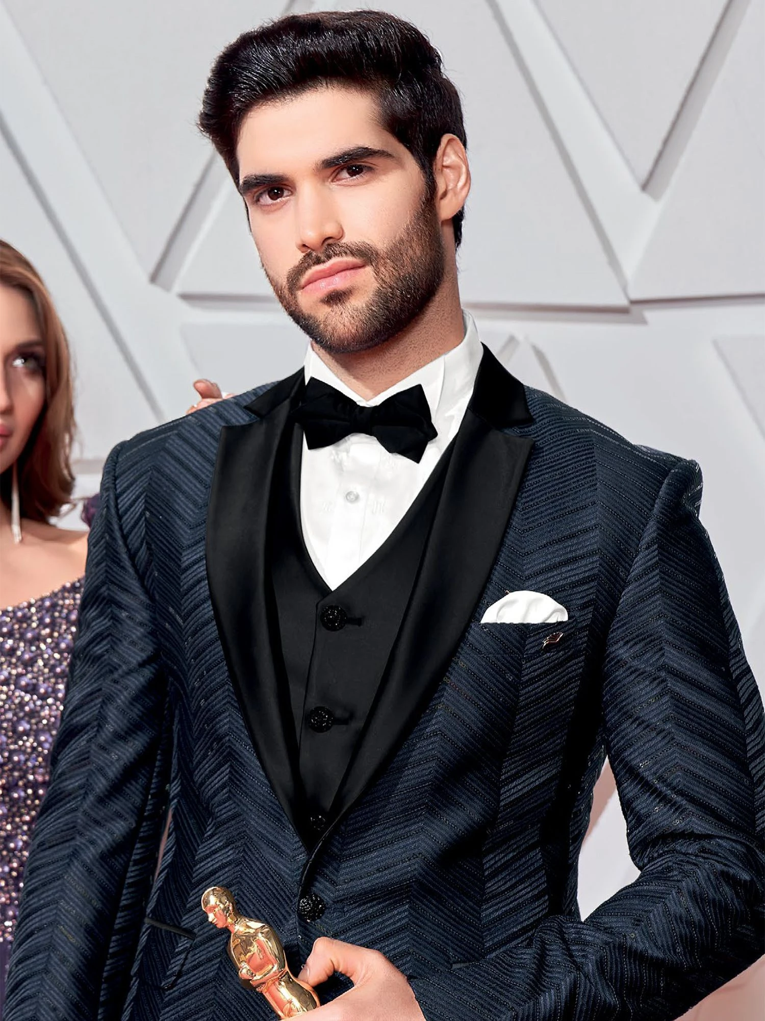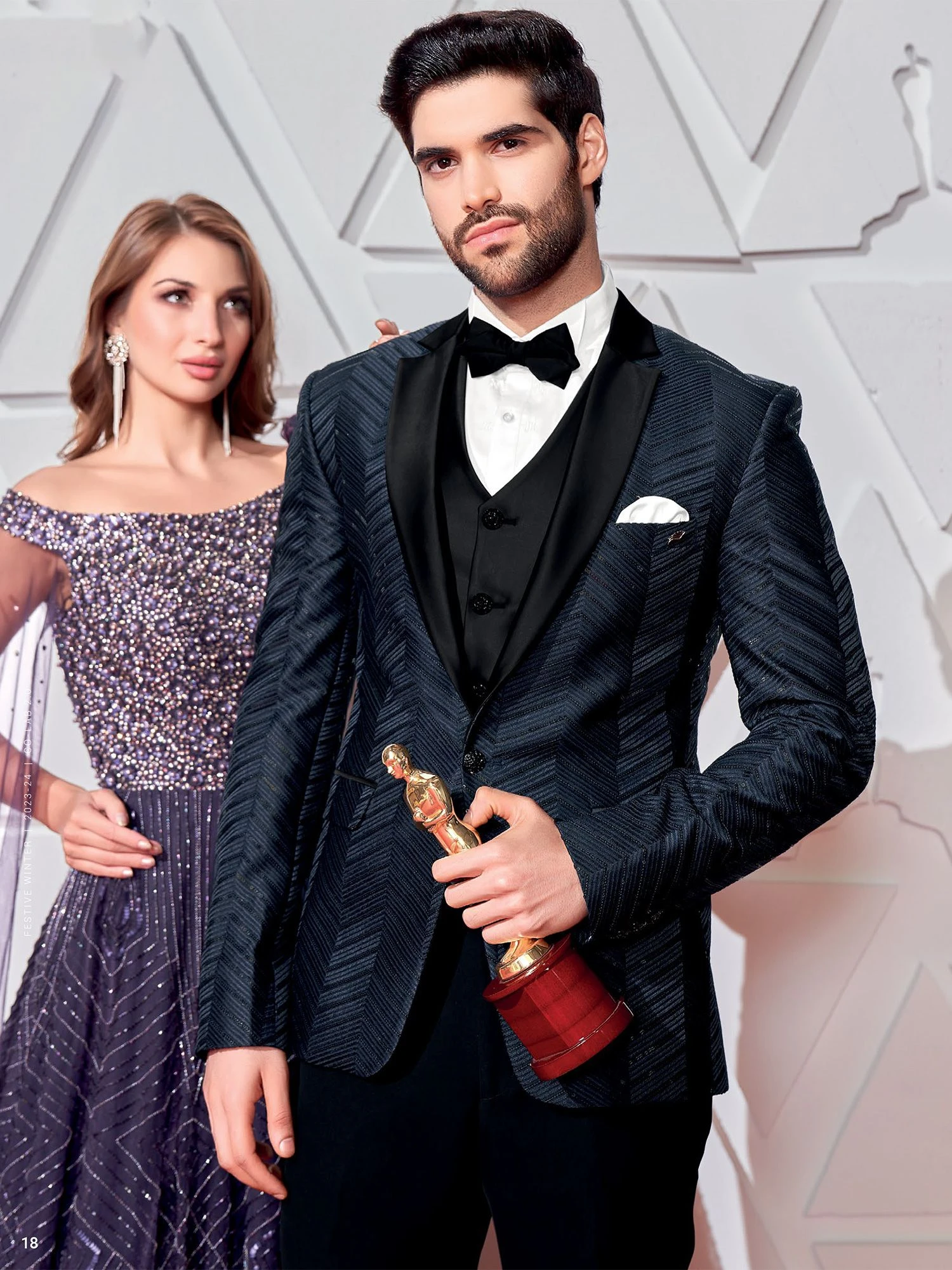 Attain a stylish vibe adorning this deep denim blue color tuxedo made in italian fabric. Manufactured with shinny sequins and thread work embellishments. Teamed with a white cotton shirt, bow tie and a matching blue trousers. Note: Some color variations may occur owing to photography causes. Up to 1 inch of measurement fluctuation is possible.