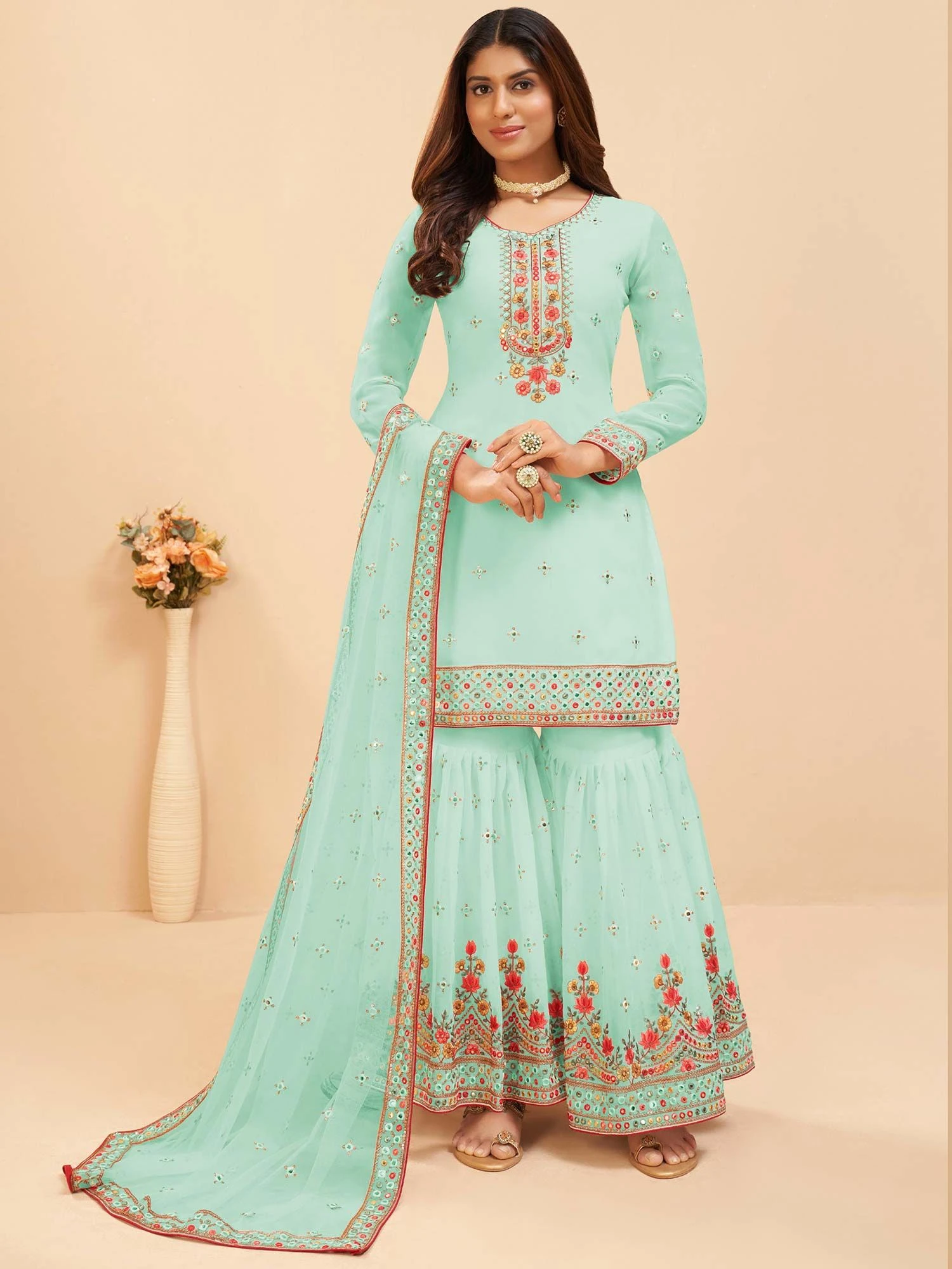 Brighten up your world sporting this light blue color straight cut kameez in georgette. Enhanced using sequins, thread and mirror work embroidery all over. Teamed with a matching georgette dupatta and a matching embroidered sharara in georgette. Note: Accessories shown are for styling purpose only. Slight color variation may occur due to photographic reasons. The semi-stitched kameez can be customised upto 42 inches.