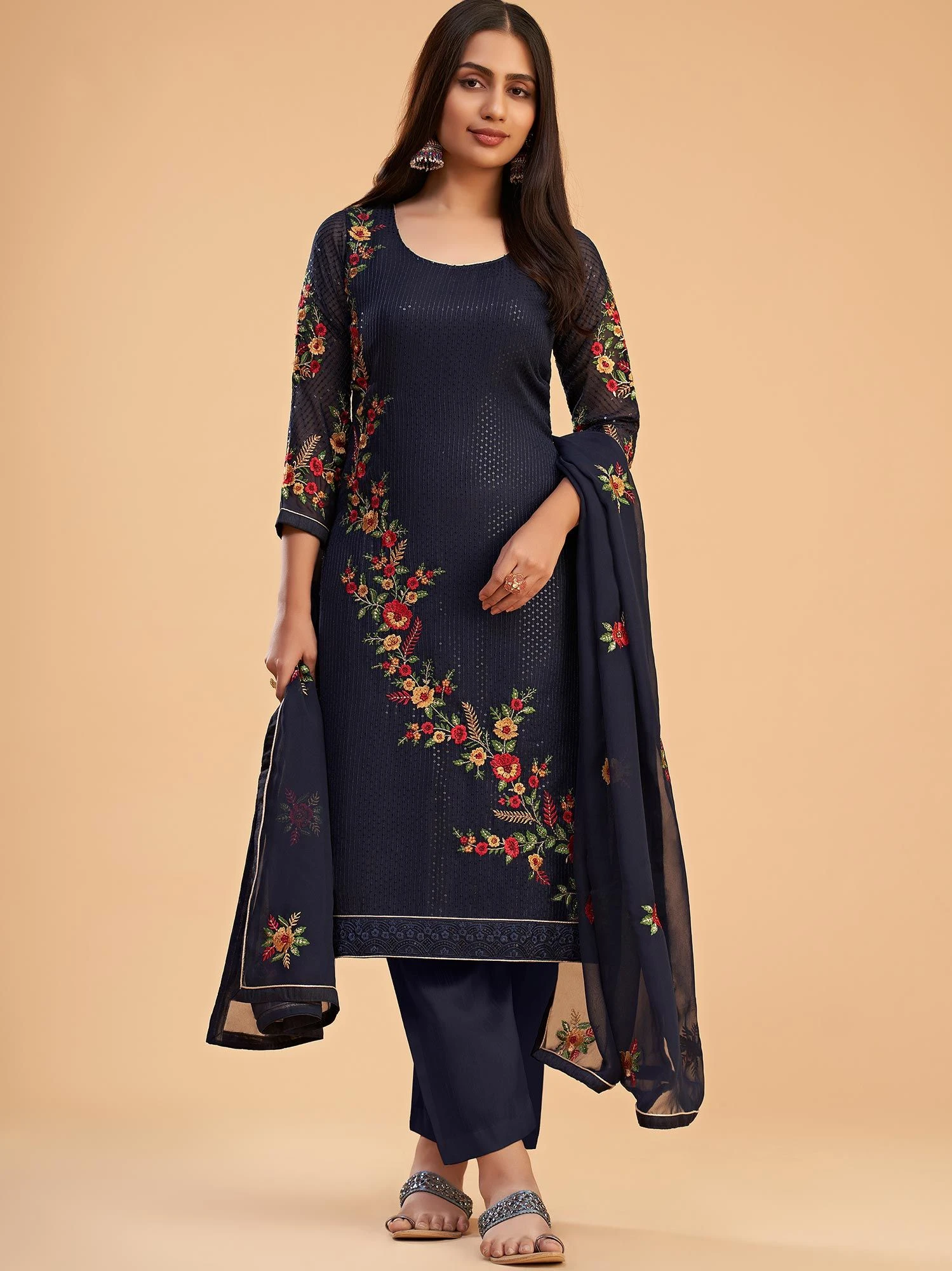 Make a flawless ethnic look adorning this denim blue color straight cut kameez in georgette. Enhanced using sequins and thread work embroidery all over. Assembled with a blue color matching georgette dupatta and matching pants in shantoon. Note: Accessories shown are for styling purpose only. Slight color variation may occur due to photographic reasons. The semi-stitched kameez can be customised upto 42 inches.