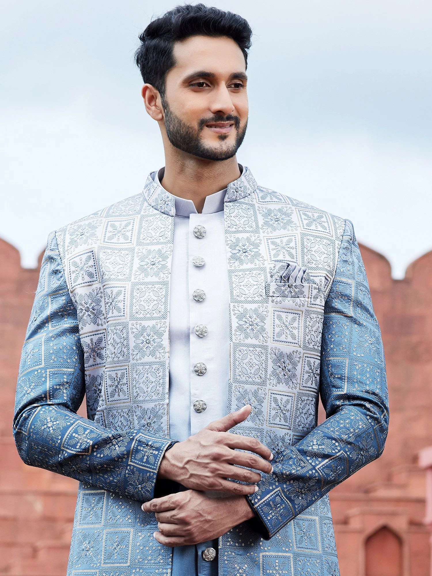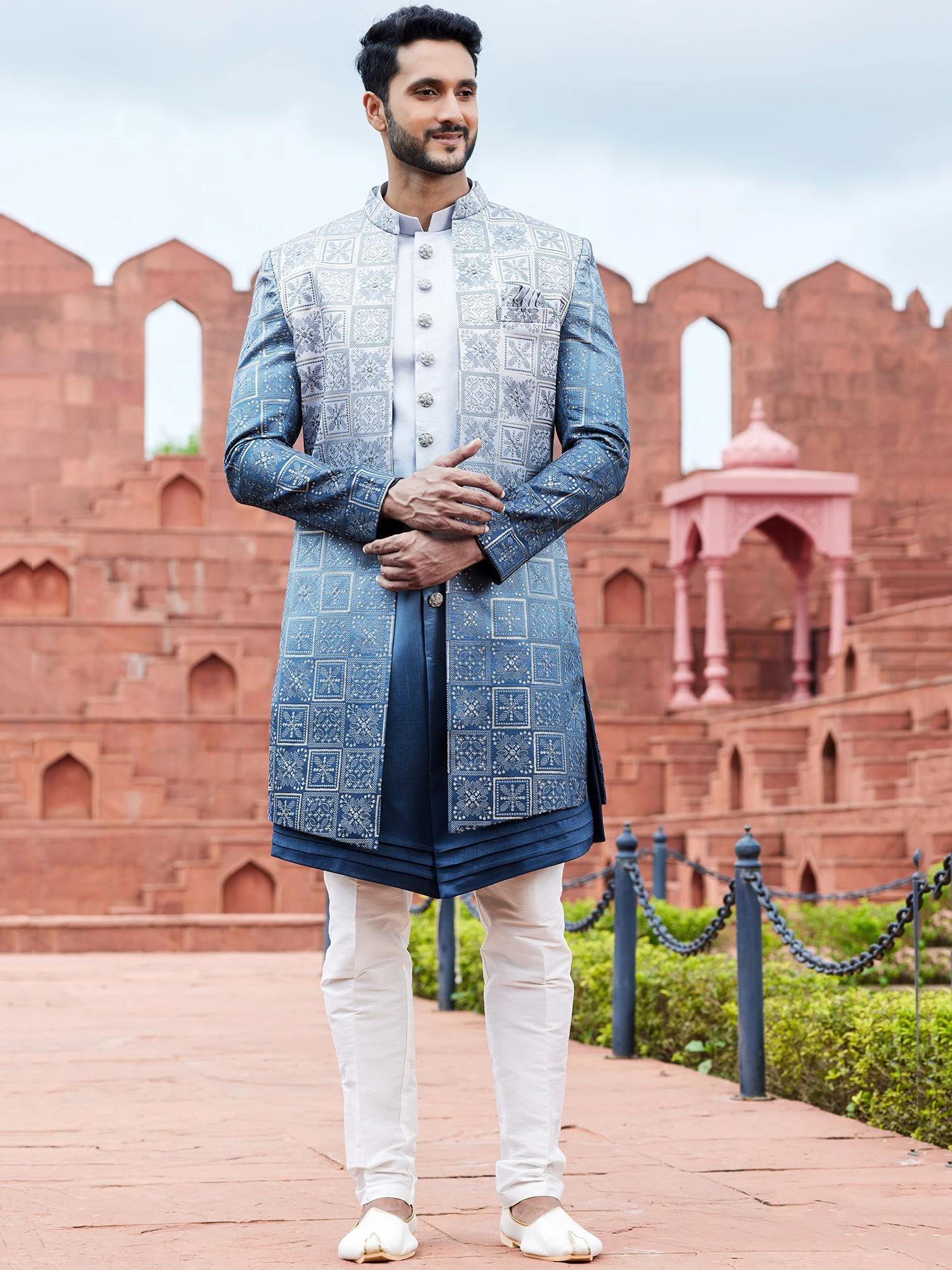 Makes it a versatile choice of every celebration adorning this blue shaded color jacketed indowestern sherwani made in silk. Augmented using sequins, thread embroidery work. Paired with off-white color churidaar in silk. Note: Some color variations may occur owing to photography causes. Up to 1 inch of measurement fluctuation is possible.