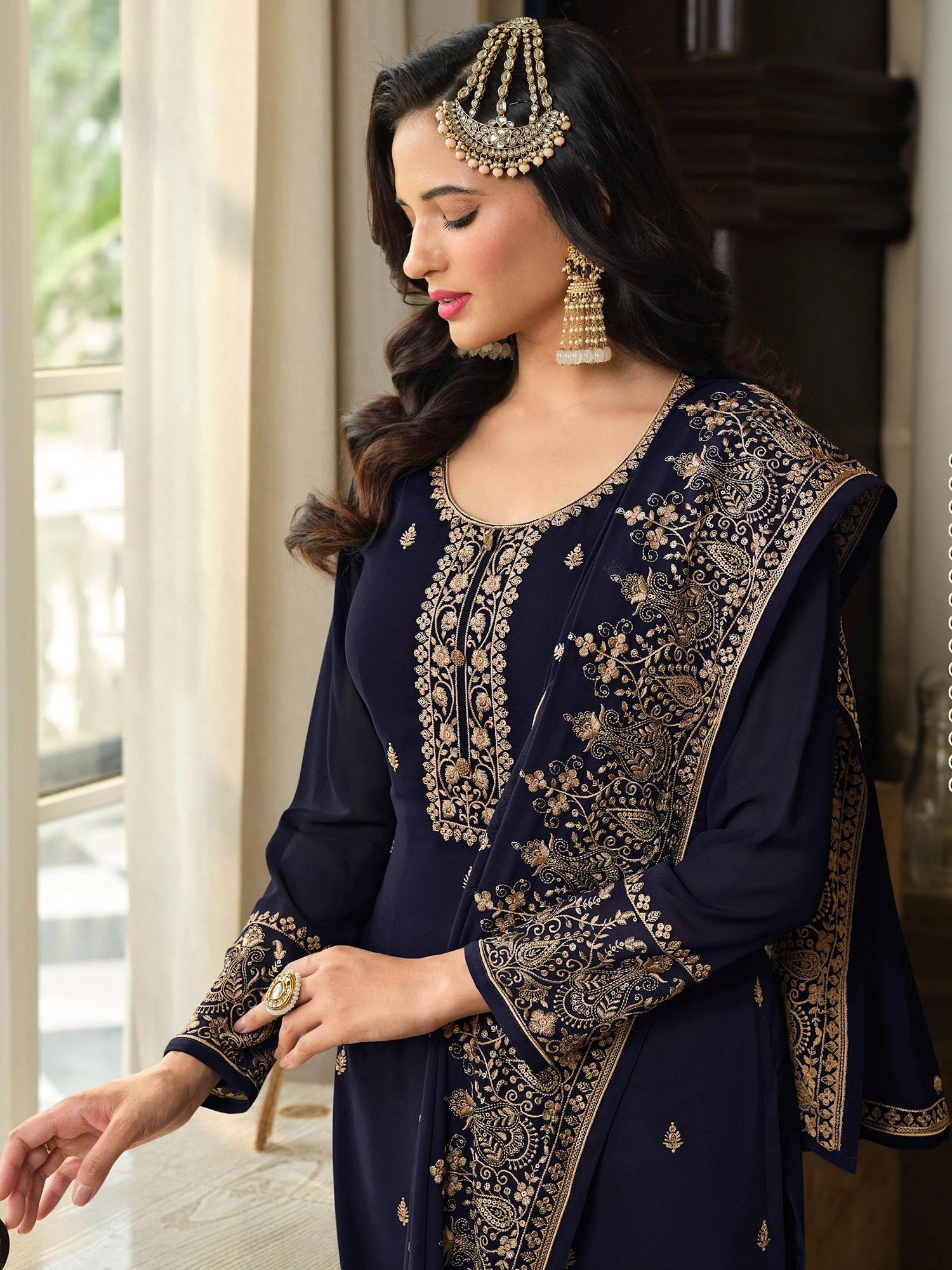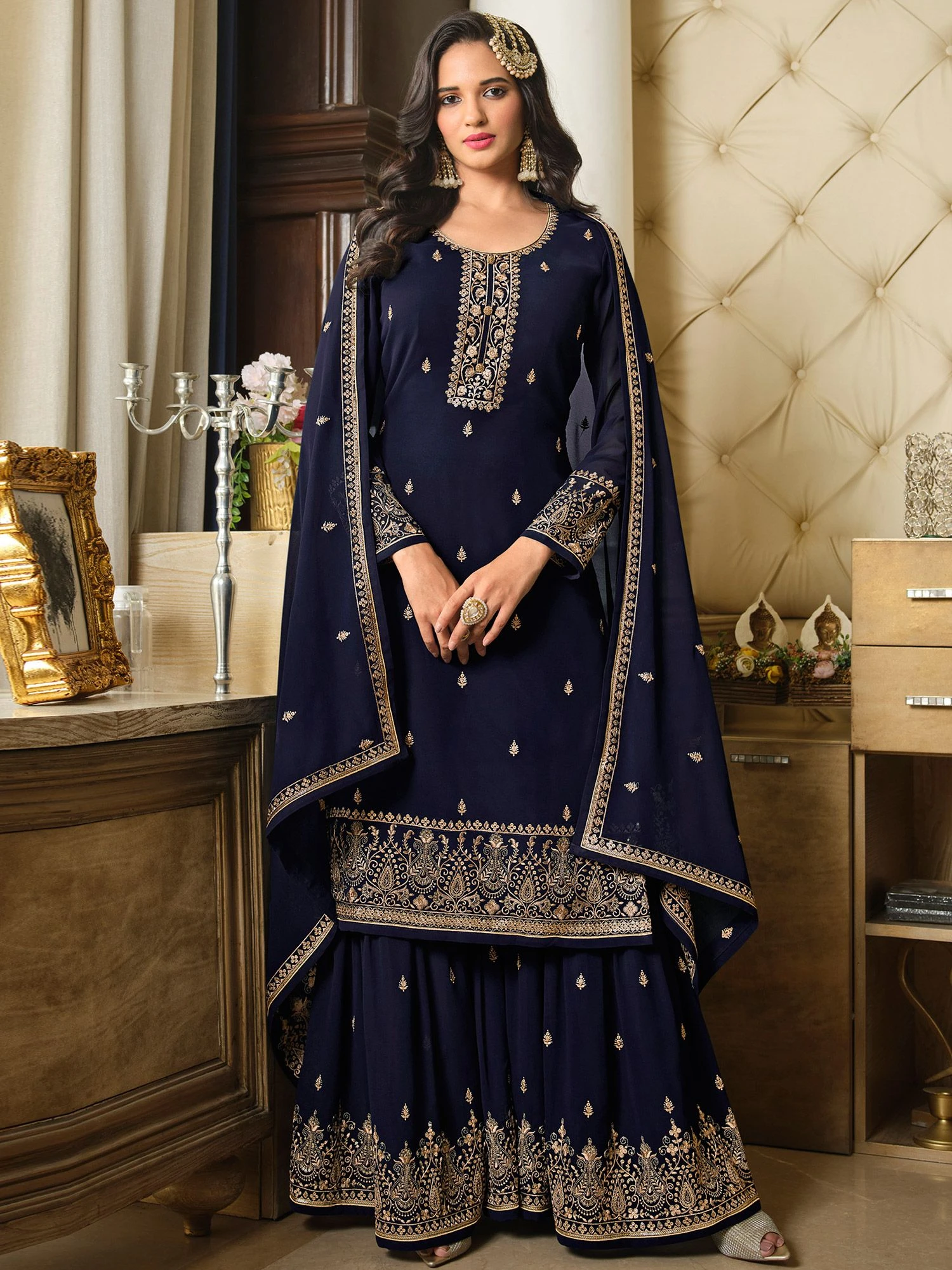 Cheer up with this navy blue color straight cut kameez in georgette. Crafted using sequins and thread work embroidery all over. Teamed with a georgette dupatta and a sharara style botttom, both made in navy blue color. Note: Accessories shown are for styling purpose only. Slight color variation may occur due to photographic reasons. The semi-stitched kameez can be customised upto 42 inches.