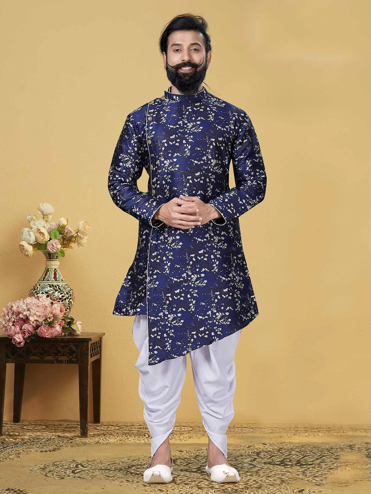 An charmingly styled Blue Colour Silk Fabric Readymade Indo Kurta that is excellent for all ethnic occasions.