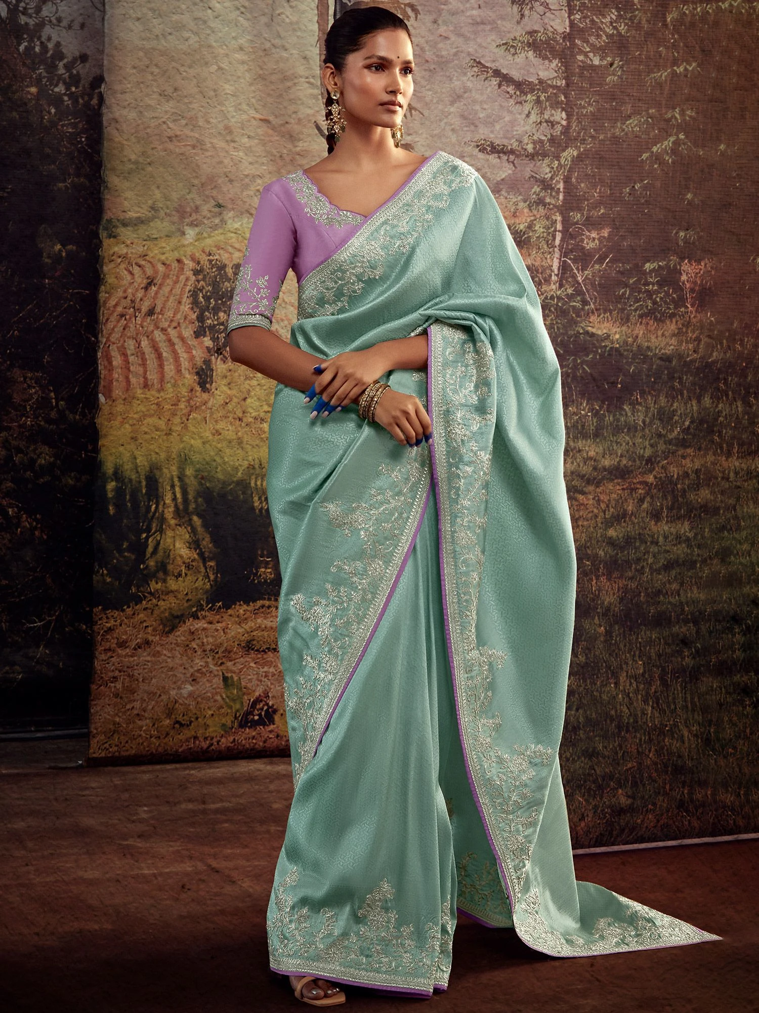 Evoke the diva in you wearing this sky blue color saree Fabricated in silk. Enhanced using zari embroidered borders, showcasing distinstive borders and pallu. Teamed with a matching lavendar purple color embroidered blouse. Note: The accessories featured are purely for fashion purposes. Due to photography reasons, some color variations may occur. The un-stitched blouse may be customized up to 42 inches.