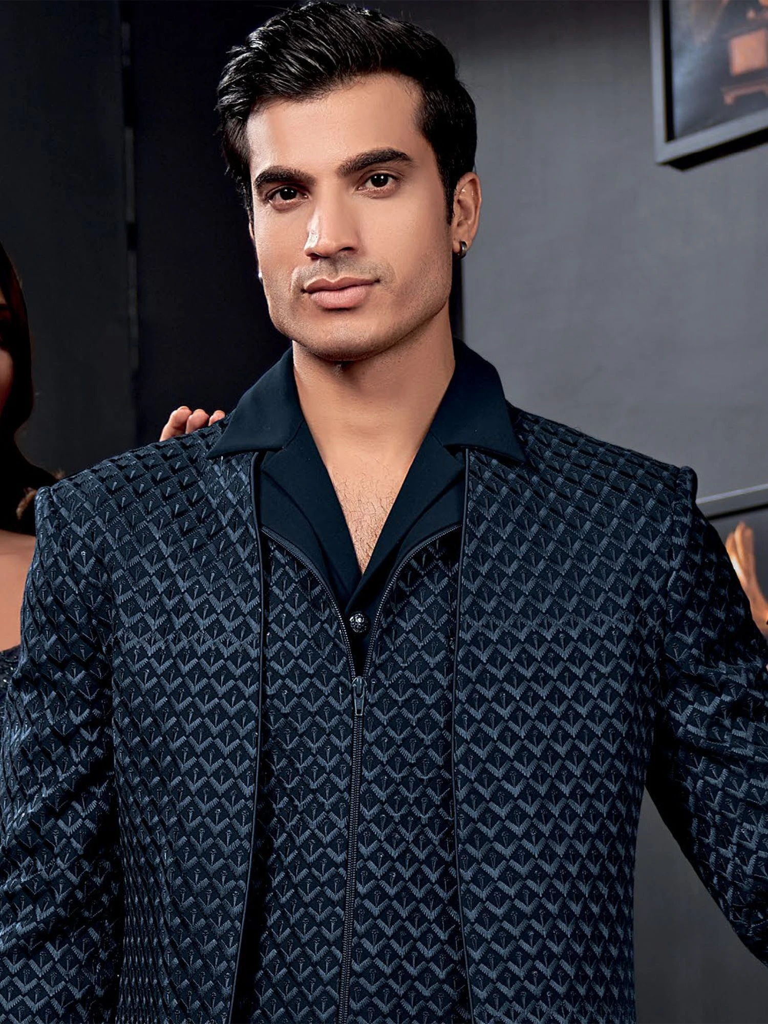 Radiate a refined charm adorning this navy blue color indo western made in italian fabric. Crafted using fine thread embroidery work all over. Comes with jacket in blue color trousers in italian fabric. Note: Some color variations may occur owing to photography causes. Up to 1 inch of measurement fluctuation is possible.