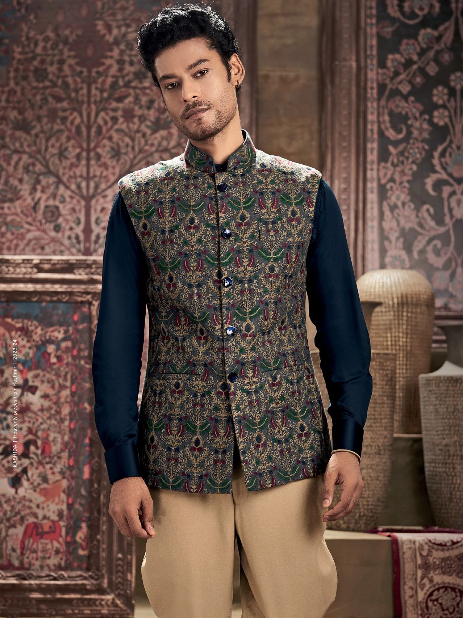 Showcasing this space blue color nehru jacket in silk. Augmented with intricate thread embroidery all over. Avaialble using mandarin collar, buttoned up front and pockets. Note: Some color variations may occur owing to photography causes. Up to 1 inch of measurement fluctuation is possible.