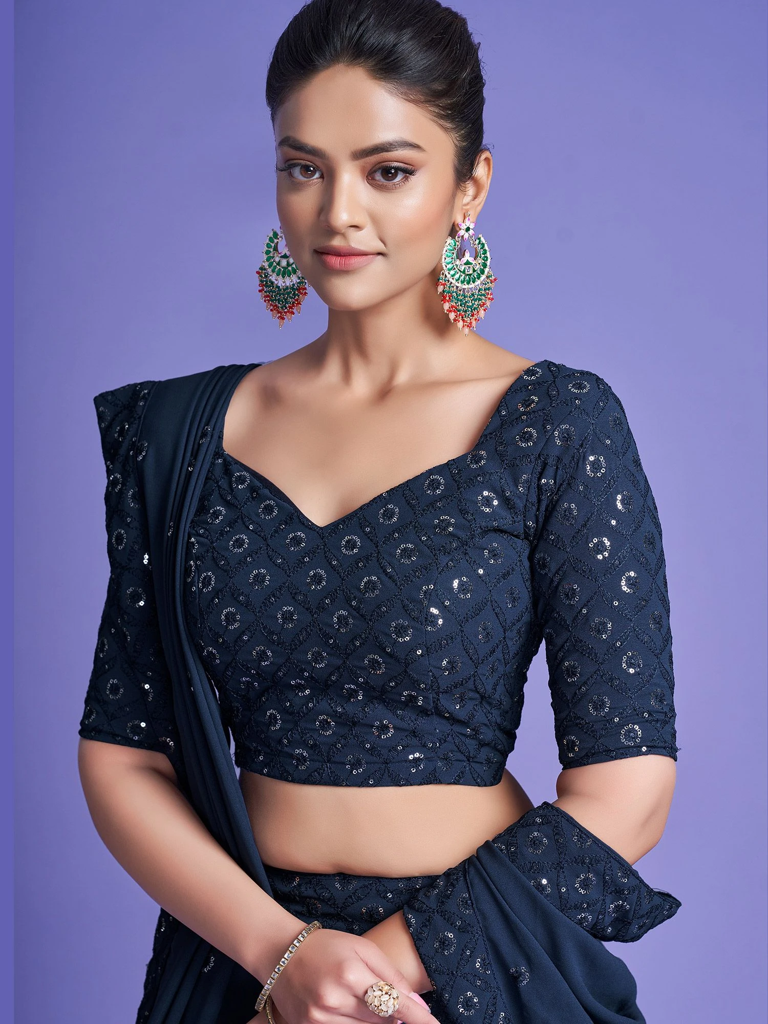 Present a graceful sophisticated look wearing this denim blue color designer lehenga in georgette. Elevated with sequins and thread embroidered work. Comes with a matching blue color embroidered choli and blue dupatta, both made in georgette. Note: The accessories featured are purely for fashion purposes. Due to photography reasons, some color variations may occur. The semi-stitched choli and lehenga waist may be customized up to 42 inches.
