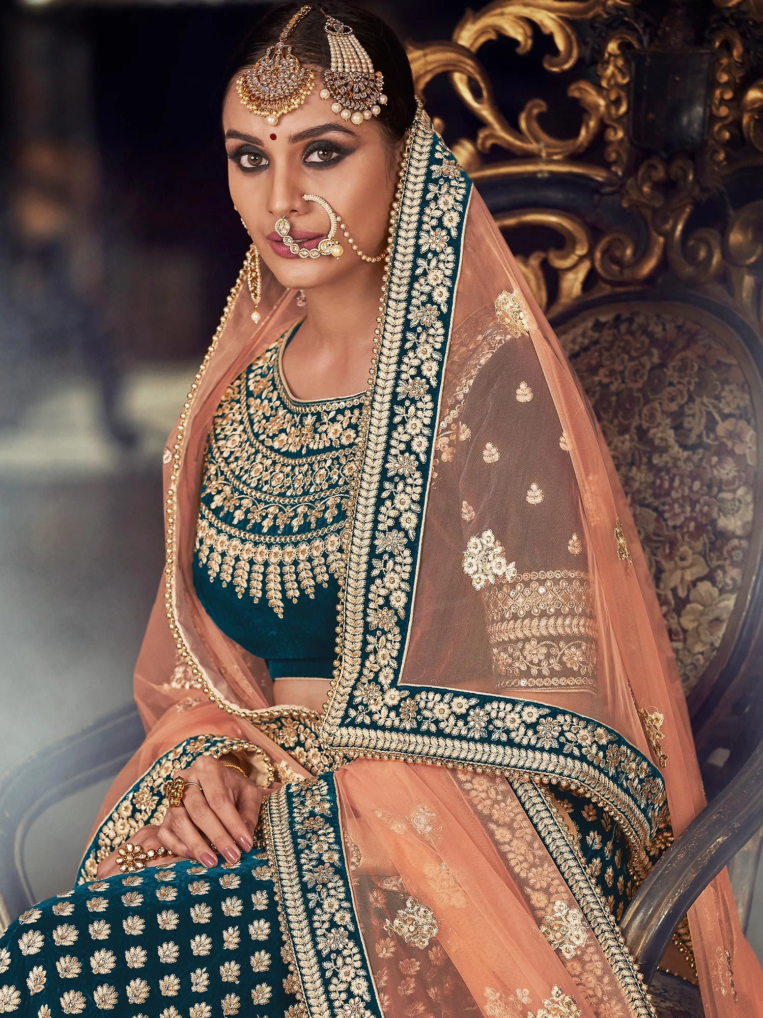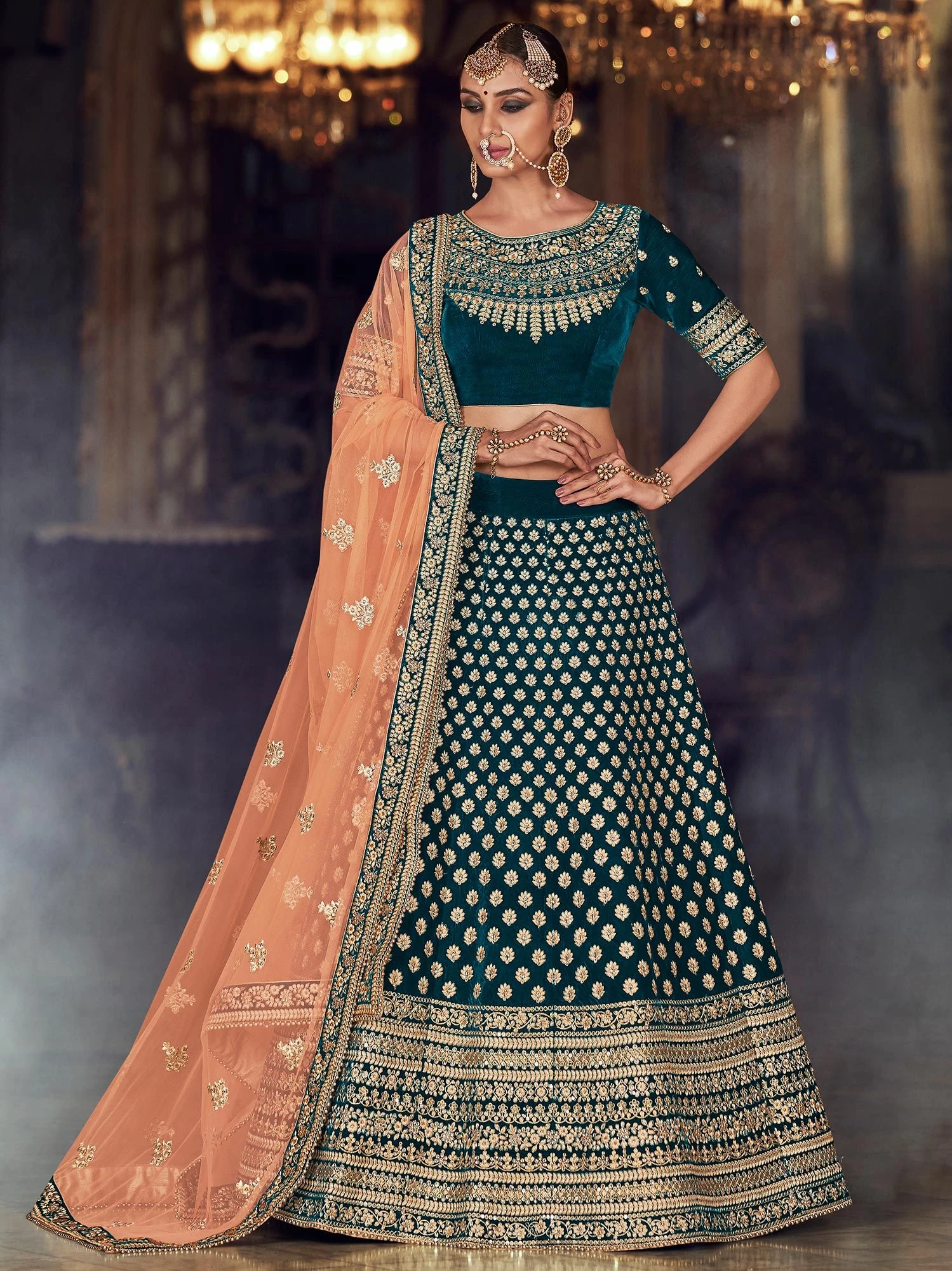 Get set to look regal wearing this prussian blue color designer lehenga in velvet. Elevated with zari, resham, stone and thread embroidered work. Comes with a matching blue color embroidered choli in velvet and peach dupatta made in net. Note: The accessories featured are purely for fashion purposes. Due to photography reasons, some color variations may occur. The semi-stitched choli and lehenga waist may be customized up to 42 inches.