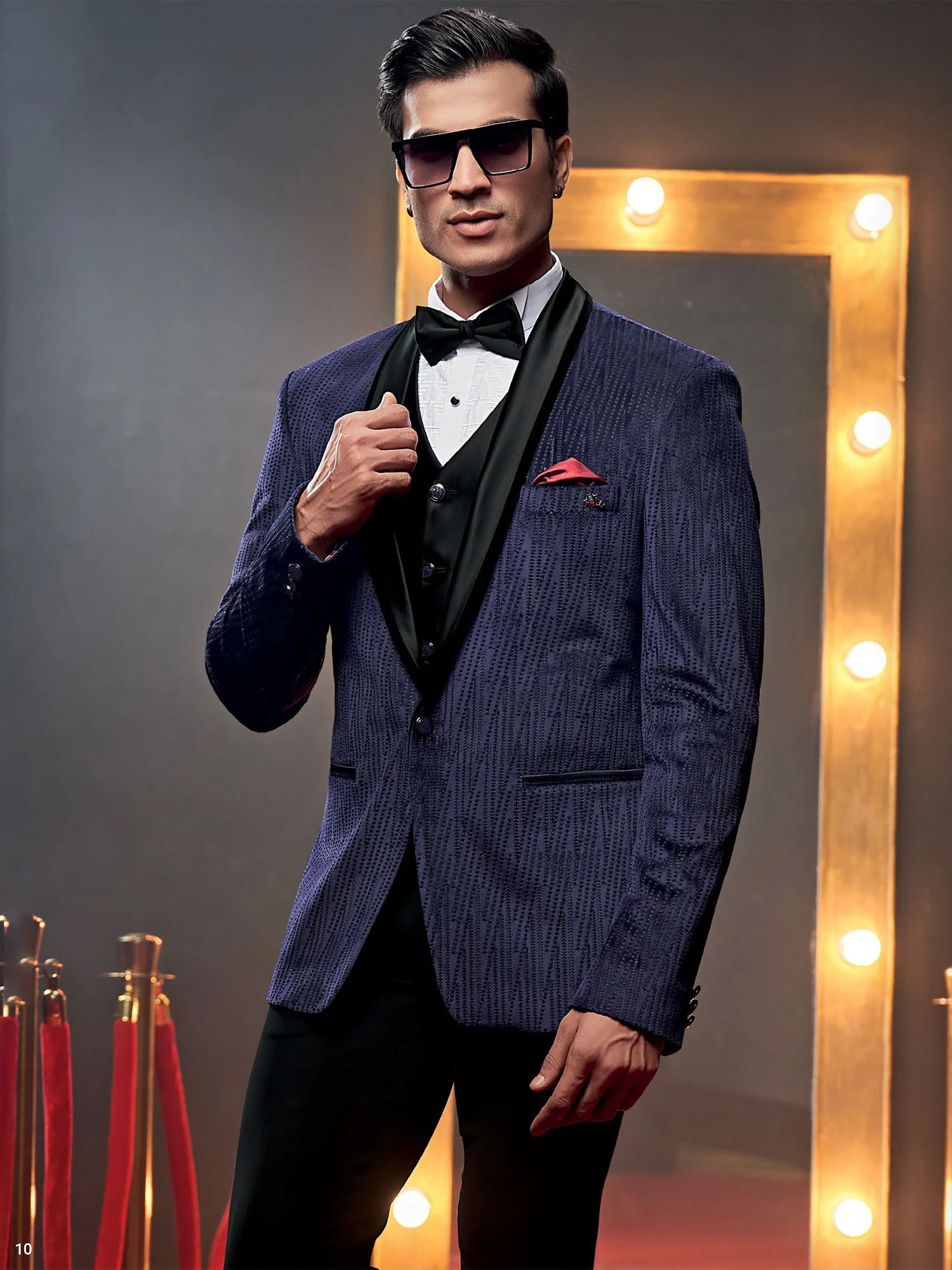 Present a fashionable front adorning this indigo blue color tuxedo made in velvet. Dcortaed with fine thread work embellishments. Available with a white cotton shirt, bow tie and a matching black trousers. Note: Some color variations may occur owing to photography causes. Up to 1 inch of measurement fluctuation is possible.