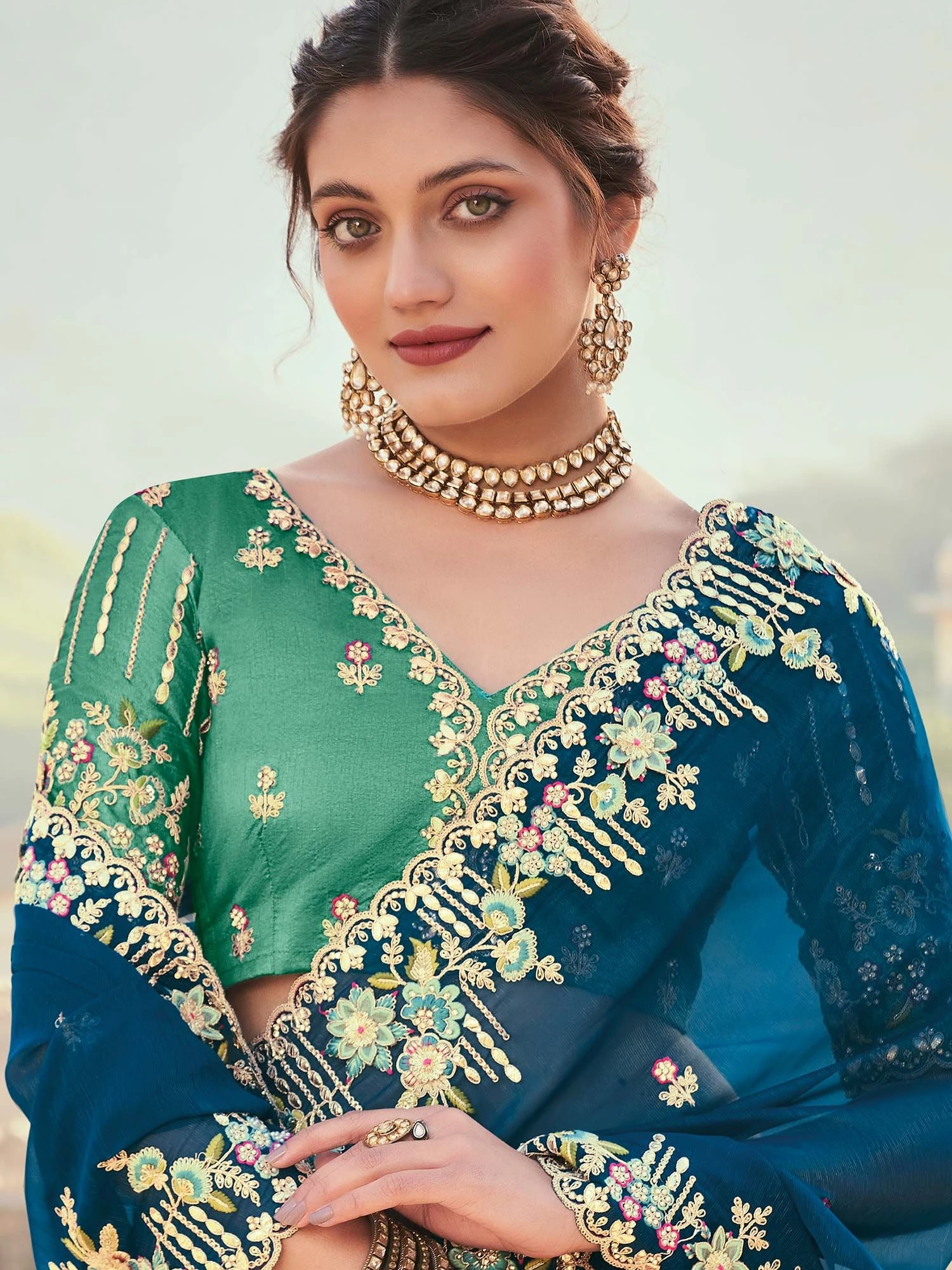 Show your feminine side adorning this aegean blue color saree crafted in silk. Furnished using sequins, thread and zari embroidered patterns with stones, displaying distinstive borders. Paired with an embroidered sea green color blouse in silk. Note: The accessories featured are purely for fashion purposes. Due to photography reasons, some color variations may occur. The un-stitched blouse may be customized up to 42 inches.