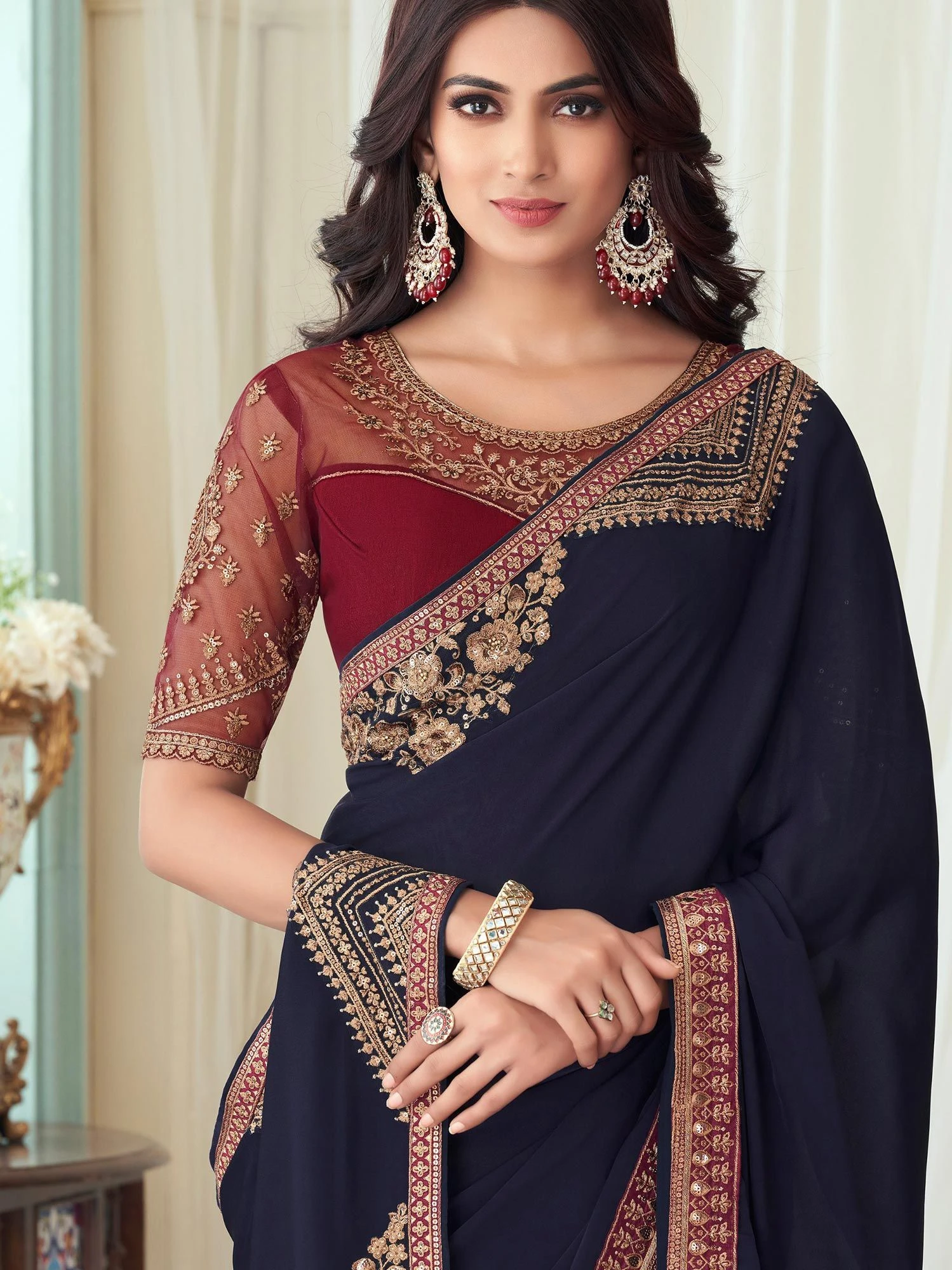 Overwhelm the audience wearing this denim blue color saree crafted in silk. Augmented using sequins and thread embroidered patterns, showcasing distinstive borders. Paired with a matching maroon color blouse in silk. Note: The accessories featured are purely for fashion purposes. Due to photography reasons, some color variations may occur. The un-stitched blouse may be customized up to 42 inches.