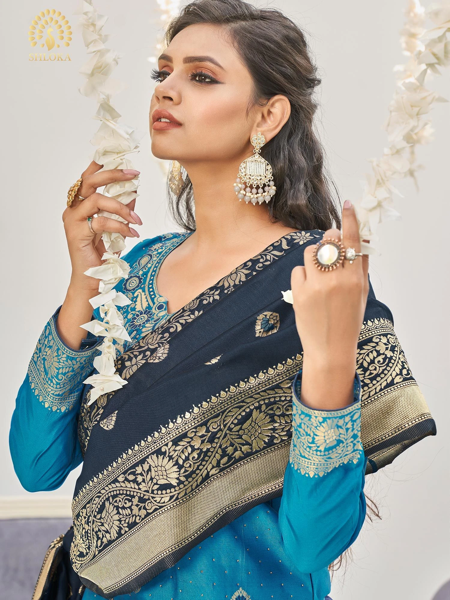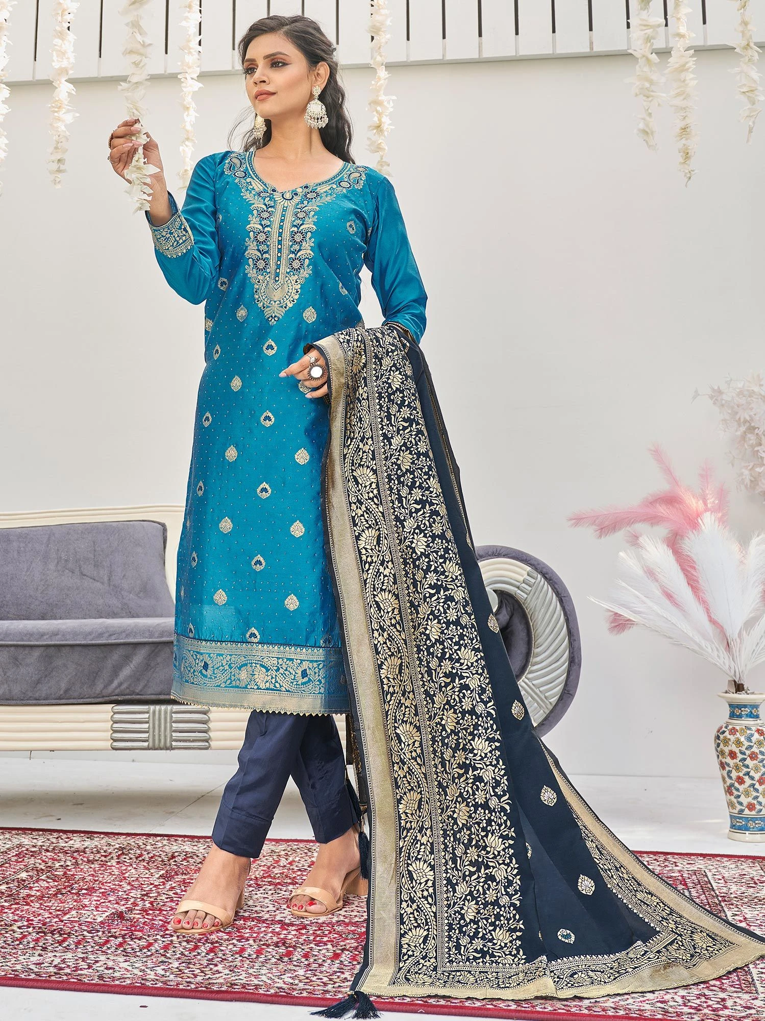 Elevate your festive wardrobe with this cerulean blue color straight cut kameez in banarasi silk. Augmented using zari woven patterns all over. Assembled with a matching navy blue banarasi silk dupatta and matching pants in shantoon. Note: Accessories shown are for styling purpose only. Slight color variation may occur due to photographic reasons. The semi-stitched kameez can be customised upto 42 inches.