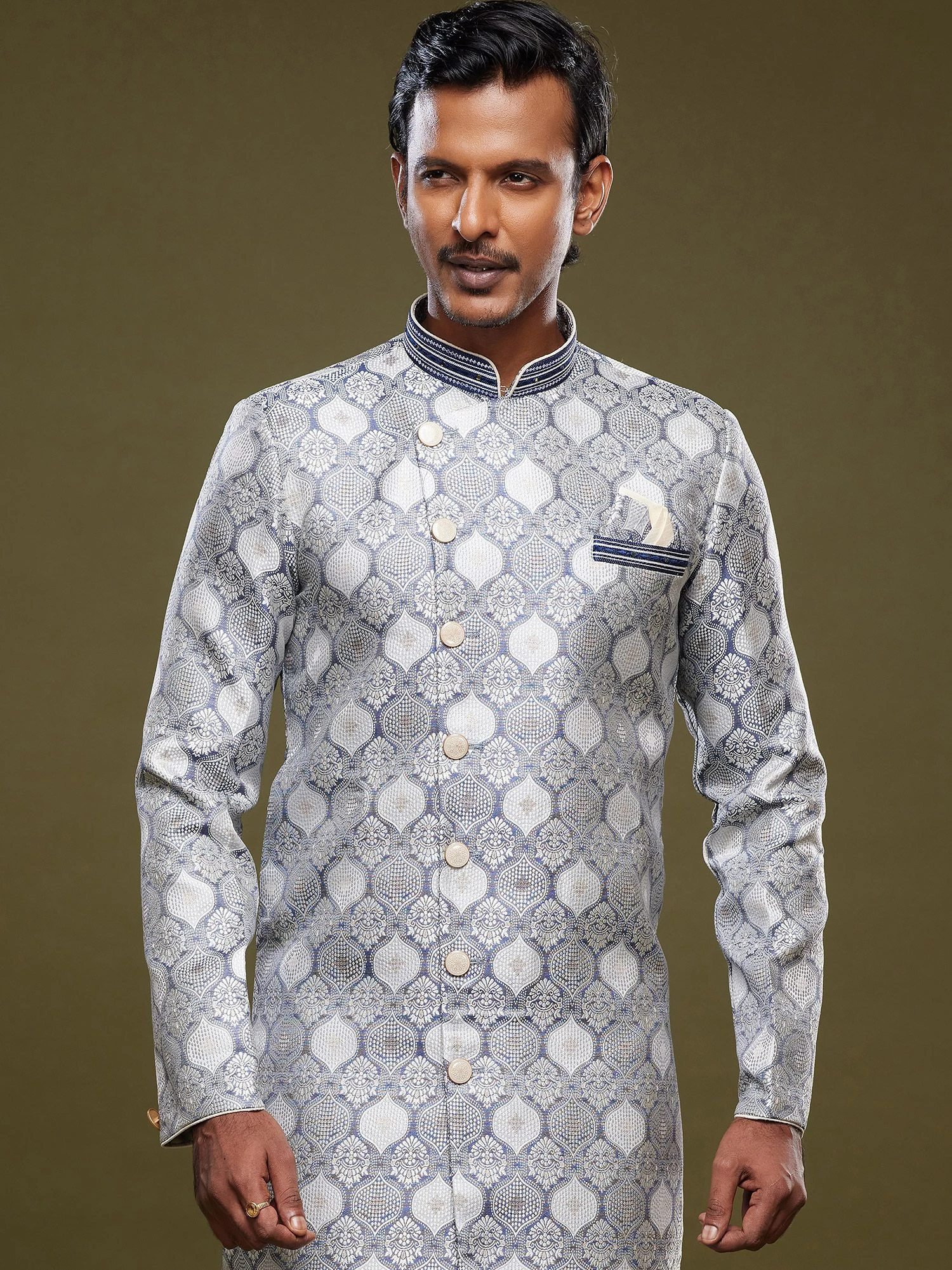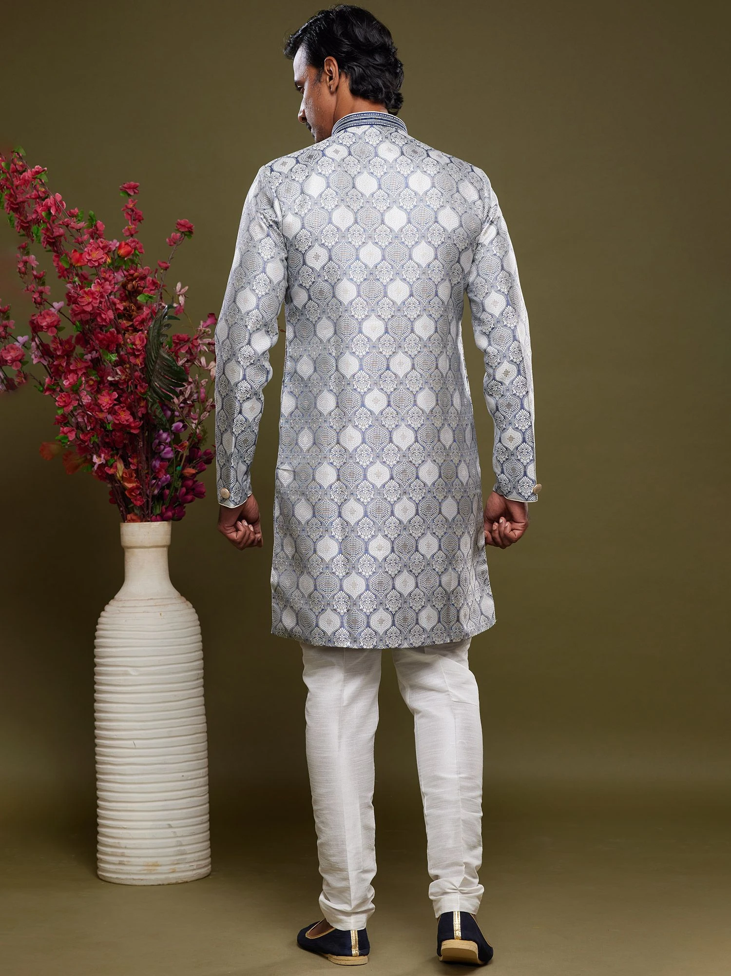 Look all graceful and fine adorning this indigo blue color indo western made in banarasi silk. Designed using jacqaurd woven work with buttoned up front. Paired with white color trousers in dupion silk. Note: Some color variations may occur owing to photography causes. Up to 1 inch of measurement fluctuation is possible.