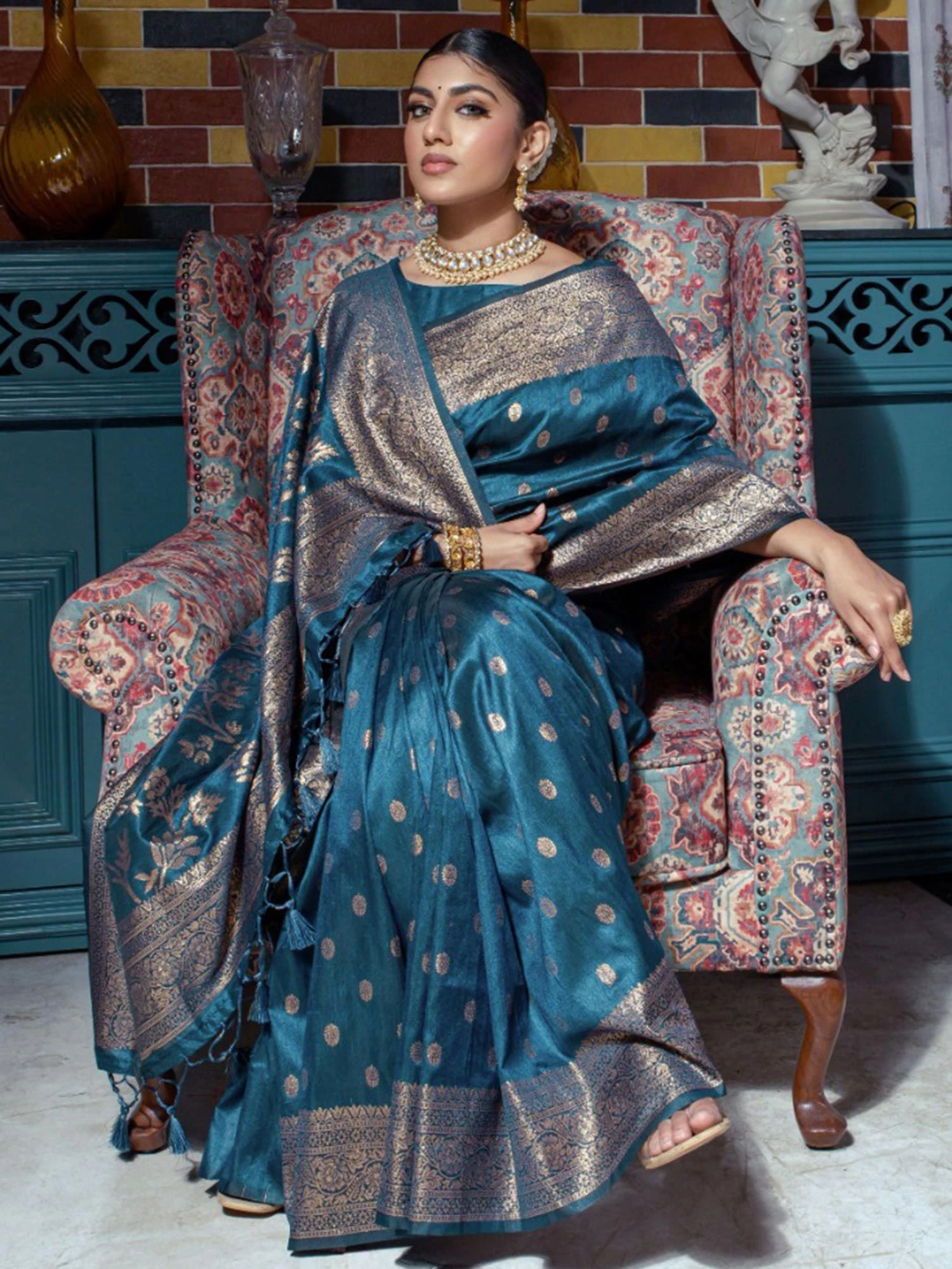 Steal the show adorning in this prussian blue color saree in banarasi silk. Enhanced using zari woven patterns, showcasing distinstive borders. Paired with a matching blue color blouse in banarsi silk. Note: The accessories featured are purely for fashion purposes. Due to photography reasons, some color variations may occur. The un-stitched blouse may be customized up to 42 inches.